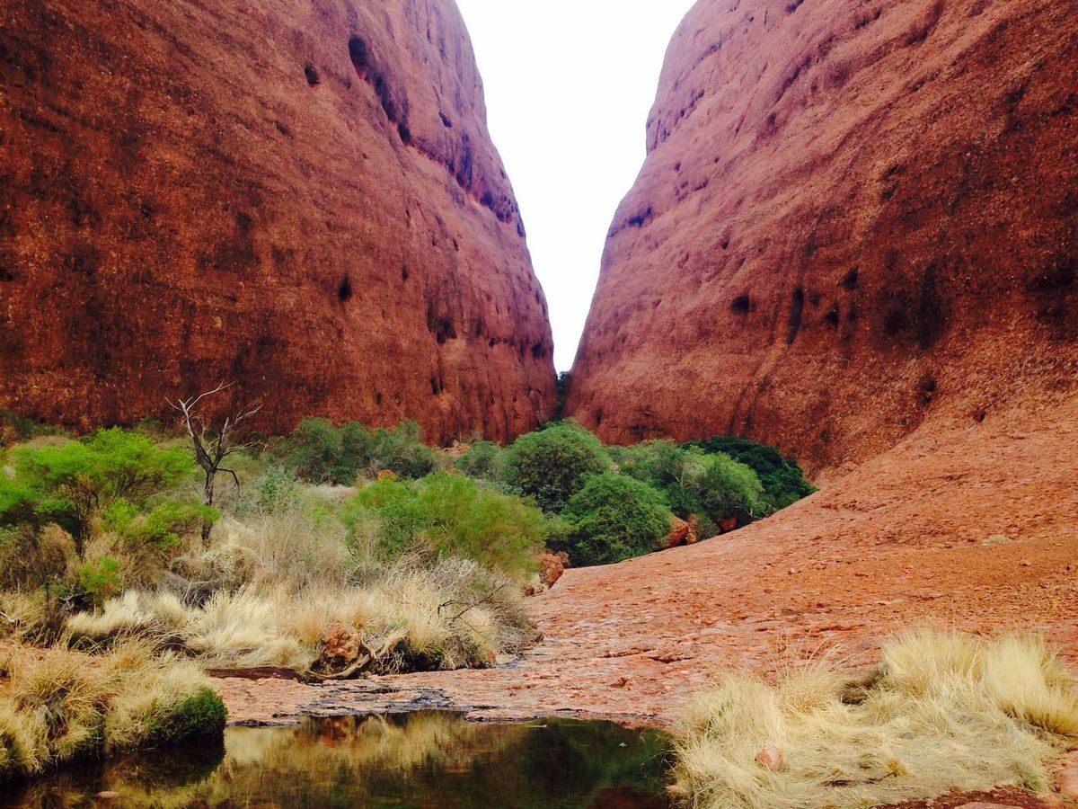 11月と言うのに気温は38℃。(もちろんオーストラリアは初夏ですが…)まずは「カタジュタ」からツアーが始まります。奇岩を背に記念写真。次にウォルパ渓谷。ここで1時間ほど散策。岩が丸く抉られていたりして面白いです。それからいよいよエアーズロックへ。夕日の沈んでいく中、ブリット(ビールやジュースの方たちも居てましたが)とカナッペとカメラ。「手が足らない」とボヤキながら刻一刻とエアーズロックの色が変わっていくのに感激!感動!言葉では言い表せない感動が体感できます。さて、翌朝は4時起き。風が少しありましたのでブルゾン等長袖の羽織るのがあると良いですが、日の出後は暑くなるので荷物にならない程度が良いでしょう。で、温かい飲み物とビスケット?をいただき、View・pointへ移動。夕日とはまったく違う感動があります。その後、移動して麓散策。昔のアボリジ人達の生活や壁画、景色を観ながら…1時間ほど。麓をバスで一周したらカルチャーセンターで休憩。クニヤ(ムティジュル)ウォーク(約45分)では伝説のお話をたっぷりと聞きながら散策します。「ハート形」の岩はパワースポットですので、必ず捜して見て下さい。とにかく空港送迎からホテルのチェックイン、空港での出発サポートと「日本語ツアーにしていて良かった!」の一言です。スタッフの皆さんに感謝です。