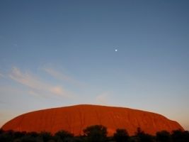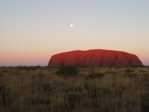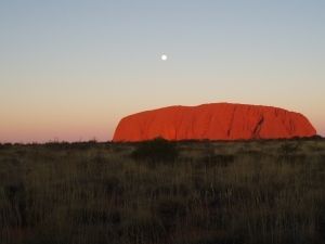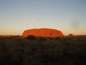 まだ仄暗い中、ウルルのサンライズビューポイントへ。うっすらと色づいた空に真っ黒いシルエットとなって浮かび上がるウルルもまた幻想的です。サンライズビューポイントは、サンセットのポイントに比べ、ぐっと近く、迫力があります。後ろから陽が昇るにつれ赤く染まってくるウルルは圧巻。ちょうど月もくっきり見え、絵のような光景でした。