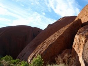 サンライズを見た後は、麓めぐりへ。マラ・ウォークとクニヤ・ウォークのふたつのルートを歩きました。間近から見上げるウルルは、まるでたくさんの山が折り重なっているように様々な表情があり、よく写真で見るウルルのイメージとは、まったく違うものでした。でも、それが一枚岩というのだから、驚きです。歩きながら、アボリジニに伝わる伝説や場所の意味などガイドさんから詳しく教えて頂けるので、日本語ツアーに参加できてよかったと思います。ウルルの質感を肌で感じながら歩いていると、シミや窪みのひとつひとつにも意味があるように思え、アボリジニにとって特別な場所であることがわかるような気がしました。登山をするよりも麓めぐりができてとてもよかったと思います。