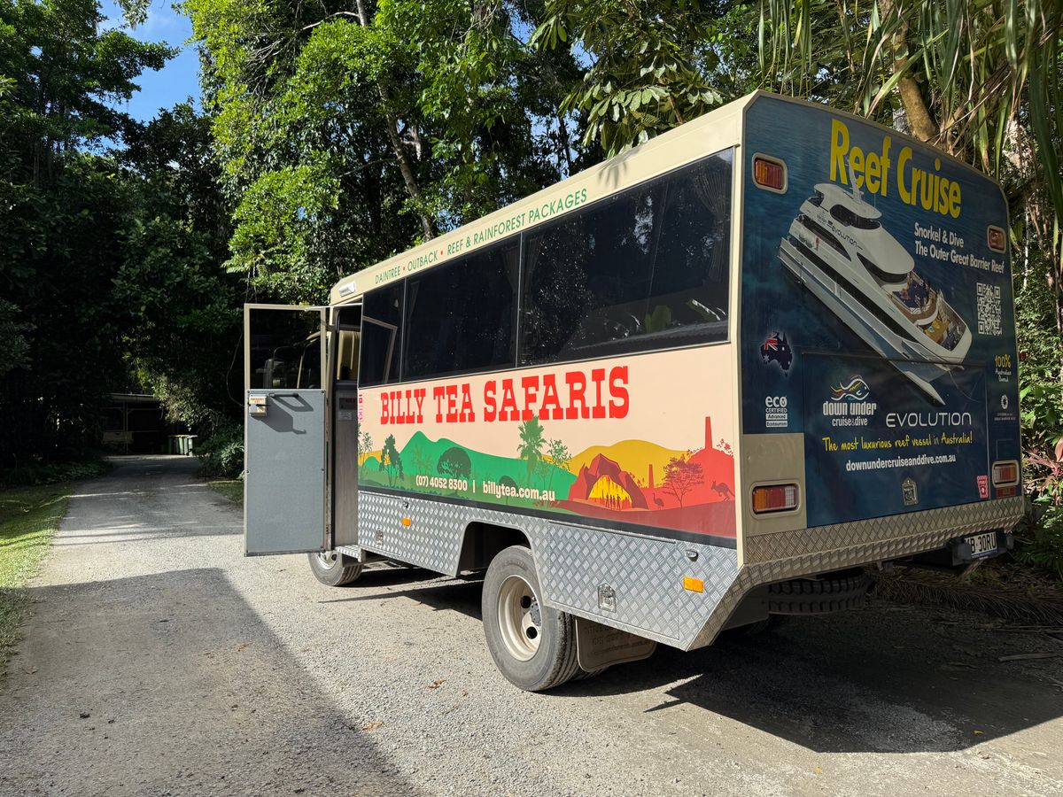 デインツリー国立公園を中心に、リバークルーズでワニをみて、ロッジでランチ、川で遊んで(泳ぐ事もできる)、散策路で生き物や植物をみて、ソーントンビーチに立ち寄り、めちゃくちゃ美味しいアイスクリームをいっぱい食べて、夕焼けが綺麗な展望台に立ち寄る、という1日の流れのツアーです。ただ、ガイドさんはかなり早口で英語でずっと説明してくださいます。かりたWi-FiをつなぎながらGoogleの同時翻訳を駆使してなんとかついていく感じでした。英語が話せない方には不向きなツアーです。バスは20人くらいで満員で、日本人は私たち2人だけでした。