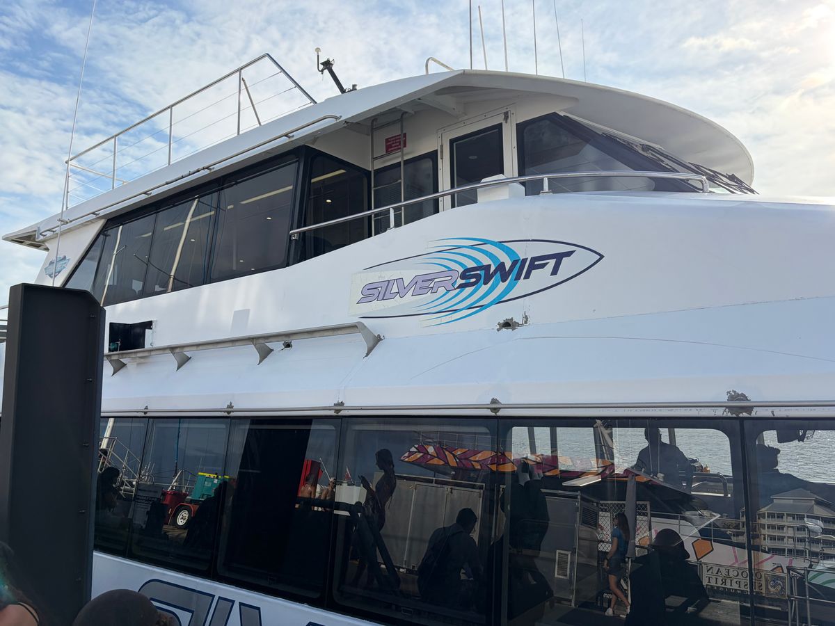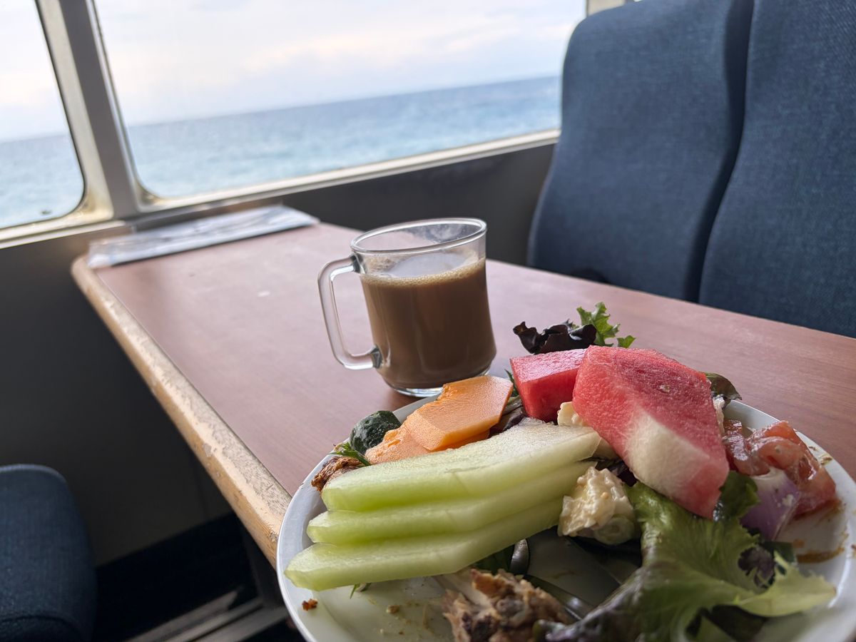 船内はエアコンがガンガンなので、防寒具、バスタオルあるといいと思います。僕は船の外のデッキにいました