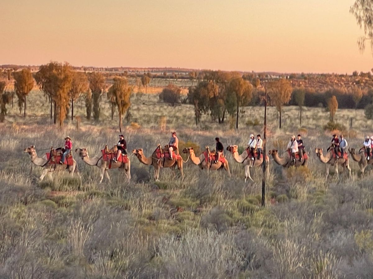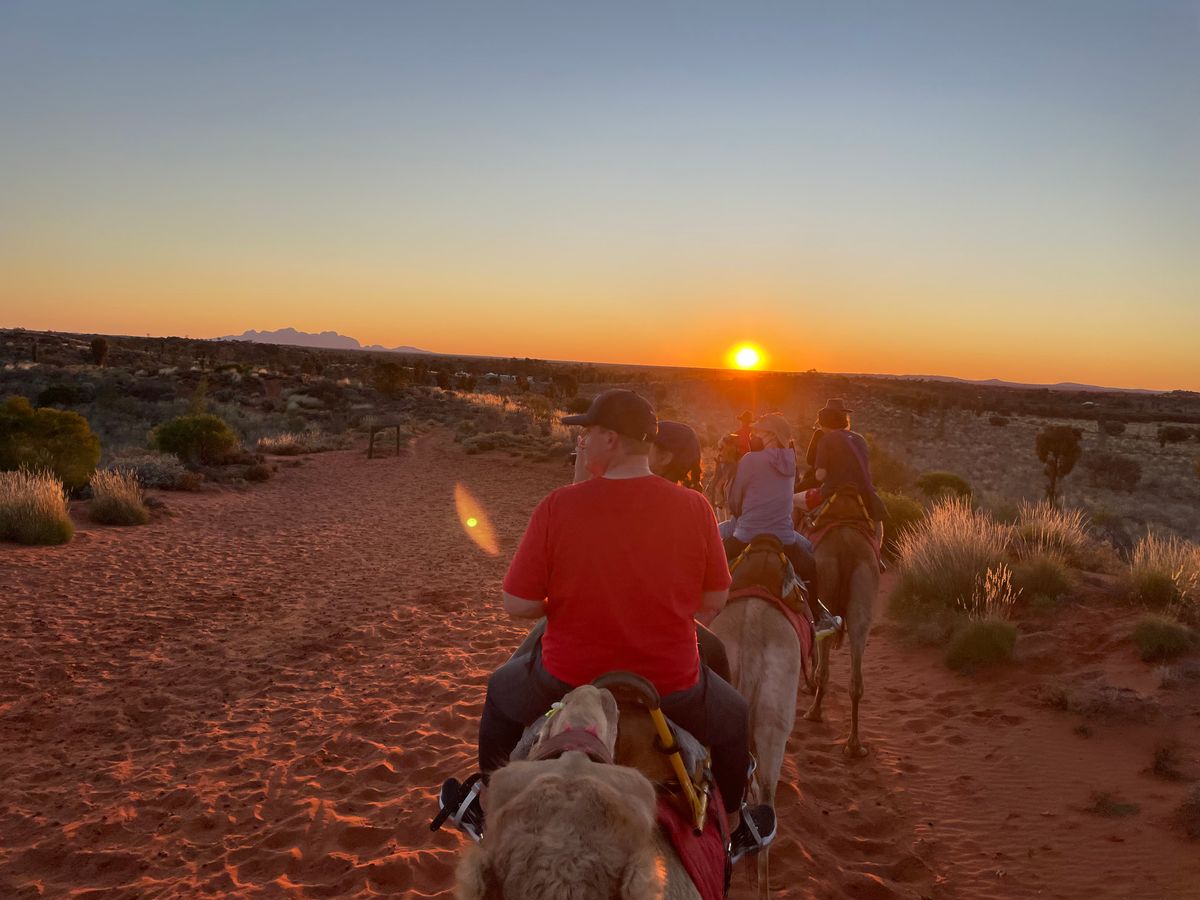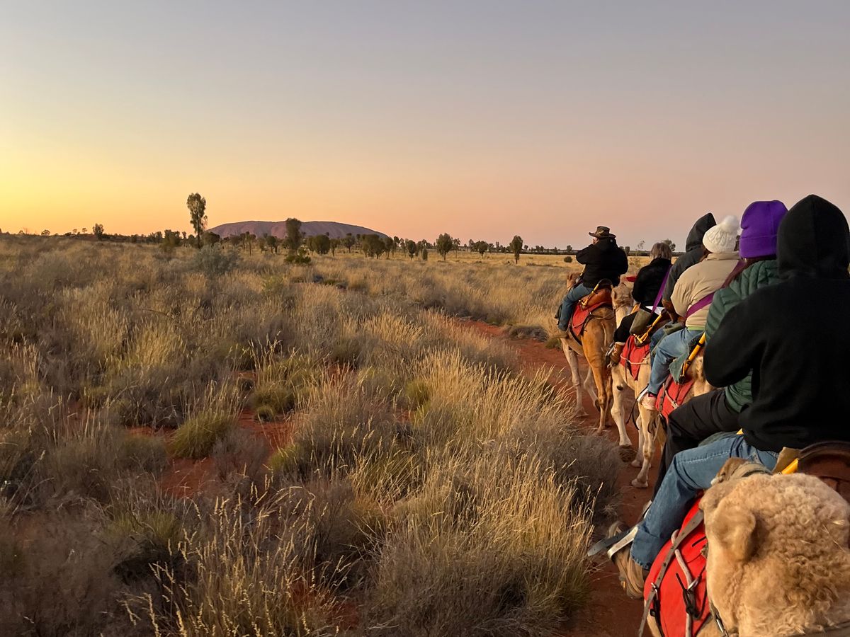ファームに着いてからは、スムーズに案内され、自分の乗るラクダが紹介されます。ラクダは10頭くらいで1チーム。先頭のラクダにスタッフがのり、サイドにも歩きのスタッフが付き添って、英語で解説が続きます。ファームの周りの丘を超えると、ウルルが見えてきます。夕陽の沈むちょうどの時刻に、ベストな場所で止まり、1頭ずつ写真を撮ってくれました。ラクダに揺られて、ウルルのサンセットを観る経験は、他ではできないすばらしい経験でした!