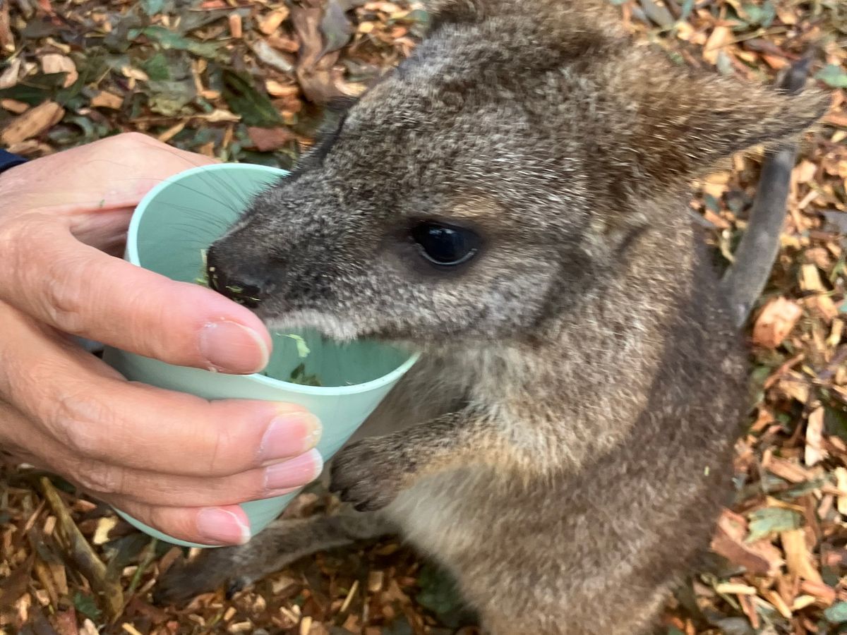ナッツを食べた後はグラナイト渓谷に移動です。赤ちゃんよりちっちゃな手で手を掴まれ(感動的!)、手から餌を食べるロックワラビーがすごくかわいいです。餌はシェーンさんが手においてくれます。