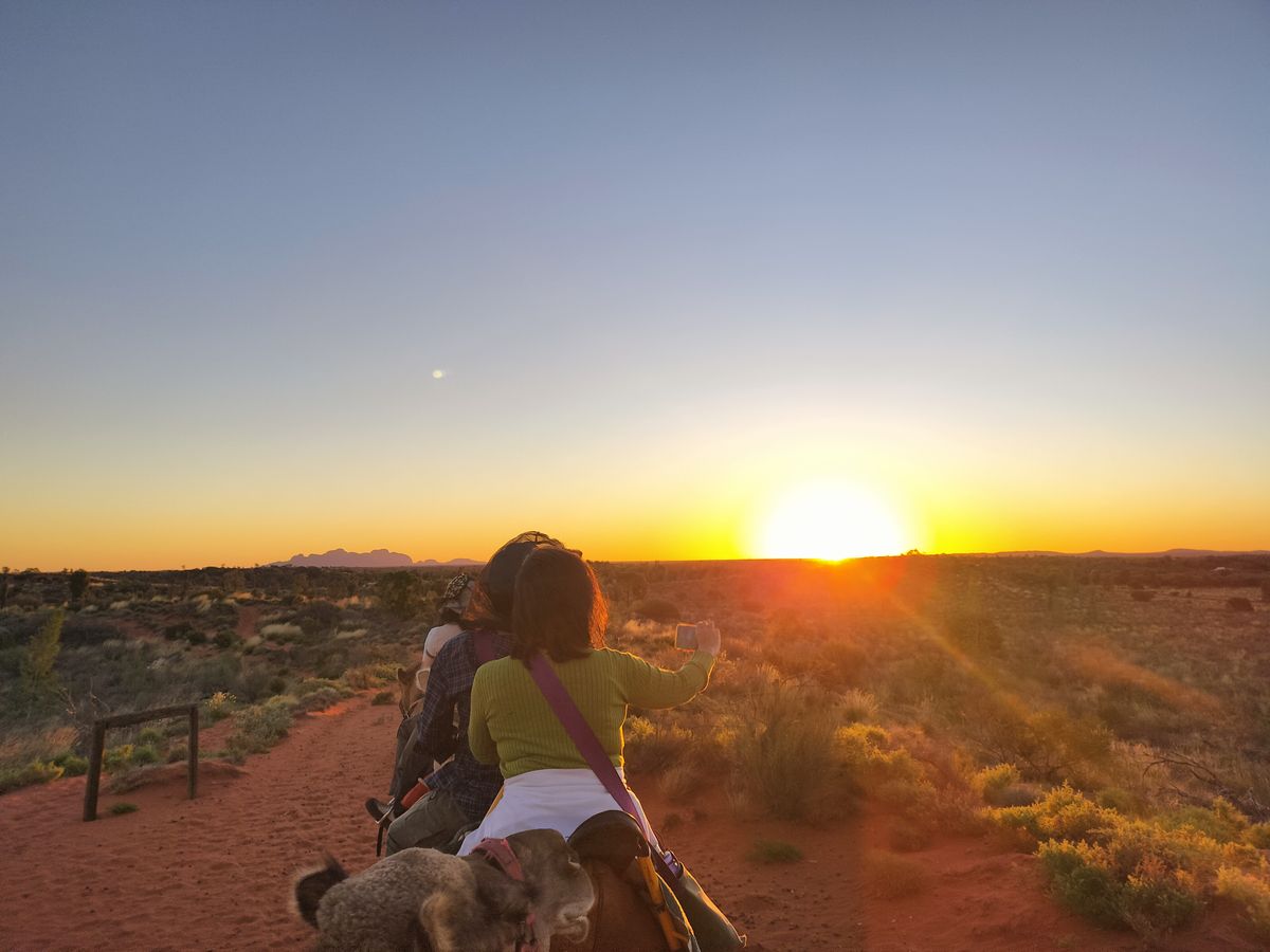 そしてかなり長い時間かけてラクダに乗ってゆっくりとウルルの見える小高い丘にやってきてサンセットを堪能。このツアーだと夕日に照らされるウルルだけでなく地平線に沈む夕日も見れて感動しました。
