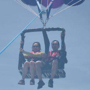 グリーンアイランドでのオプショナルツアーで申し込みました。あっという間に海上50メートルに飛び上がり、360度の水平線パノラマに感動しました。10分間の体験ですが、最高でした。デジカメを渡され、写真をデータで購入できました。