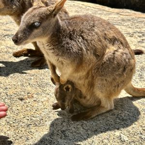 今の時期はイチジクの実がなる前で食べるものが少ないせいか、お腹にJoey(ジョイ:ロックワラビーの赤ちゃん)を入れたお母さんワラビー達が