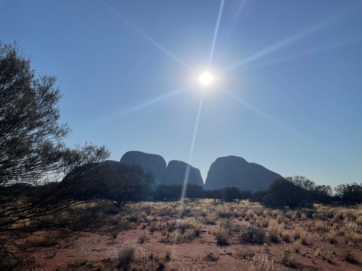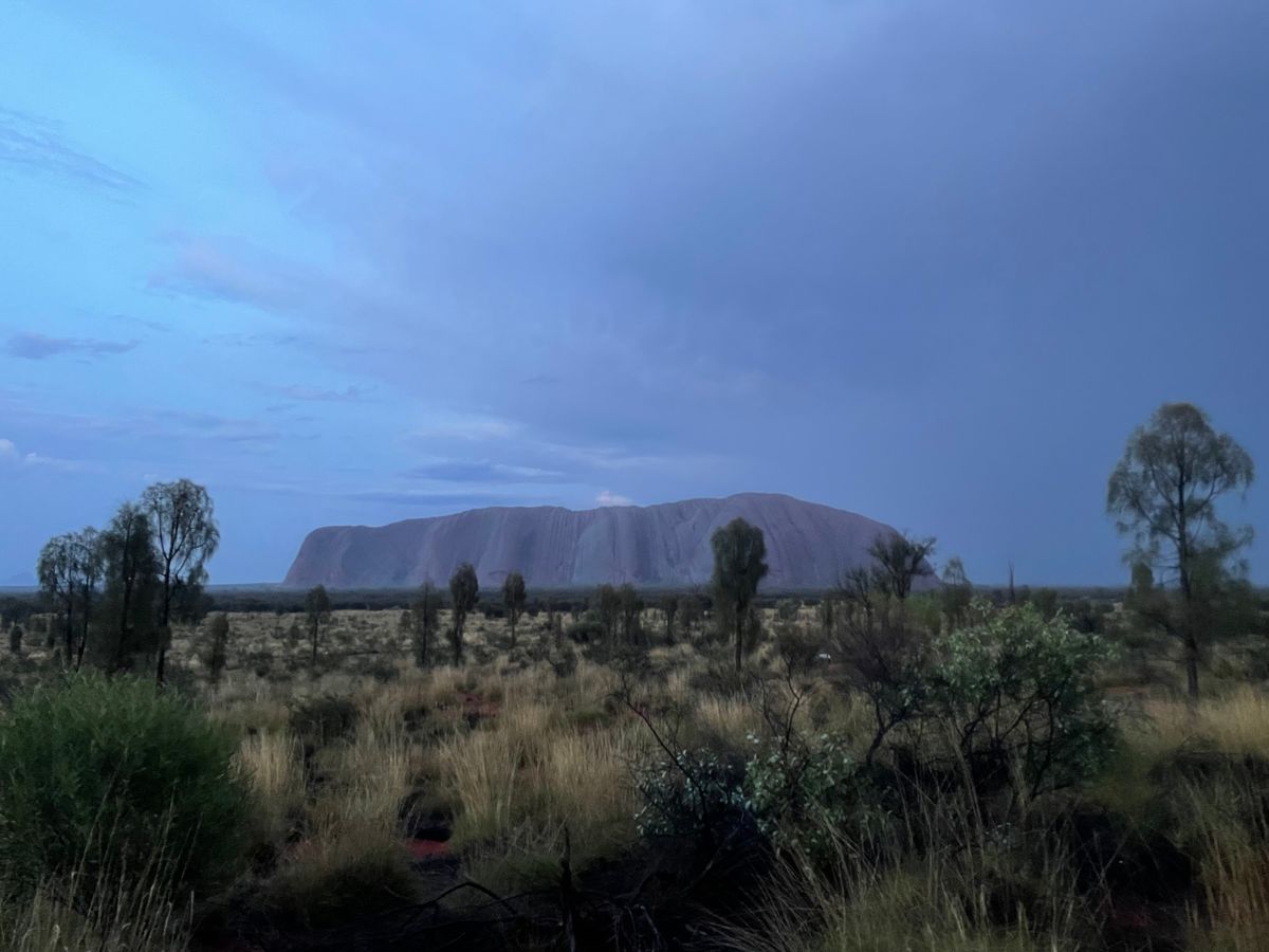 さて、長くなりましたが、11月は4時半出発。このツアーはまずは何ヶ所かの展望台から、美しい朝日に照らされて刻々と色を変えるウルルの姿をじっくり見させてくれます。お天気がイマイチの始まりでしたが、Mieさんが、「こういう天気の方が過ごしやすいし、ちょっと雲があってその切れ間の日光はとても美しい。そして天気はコロコロ変わるのがここ。これが今日しか見れないウルル」と包み込むような言葉をくださって心からそうだなと思えました。実際、日の出前は空が半分雷雲で、雨がザッと降ってどうなることかと思いましたが、結局すぐやんで、素晴らしい日の出とウルルが見えました。