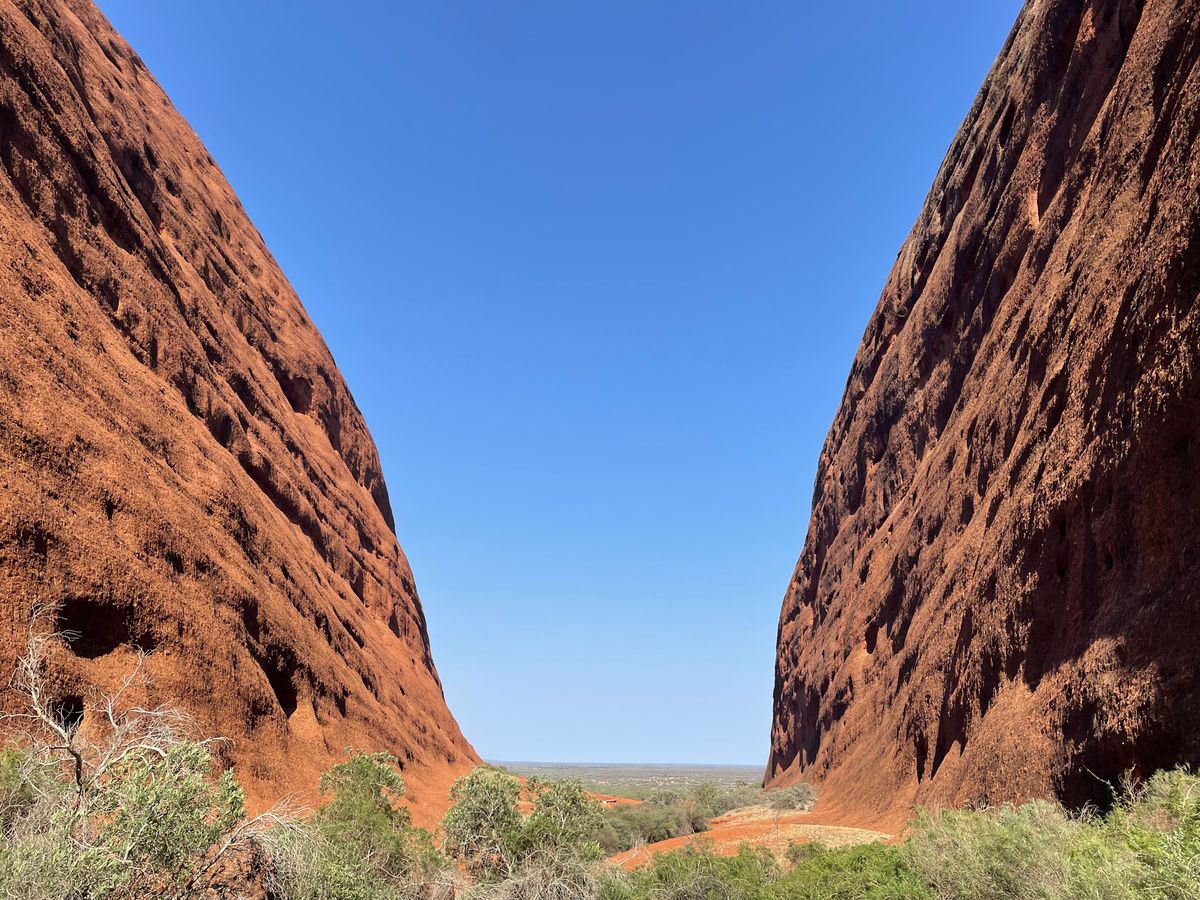 日が昇ってからはすっかり晴れてカタジュダに移動。風の谷(ウォルパ渓谷)を往復1時間ほど歩きます。これが美しかった。足元がかなりゴツゴツしているので、足を見てないと危ないのですが、近くの岩肌も、転がる岩も、赤い岩山全体も、そして谷の向こうに見えるステップ気候の草原と空!この世のものとは思えない大きさと広さです。