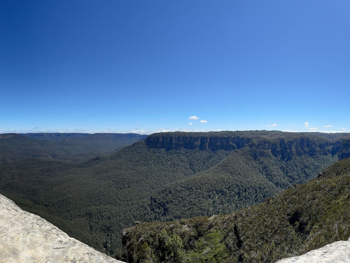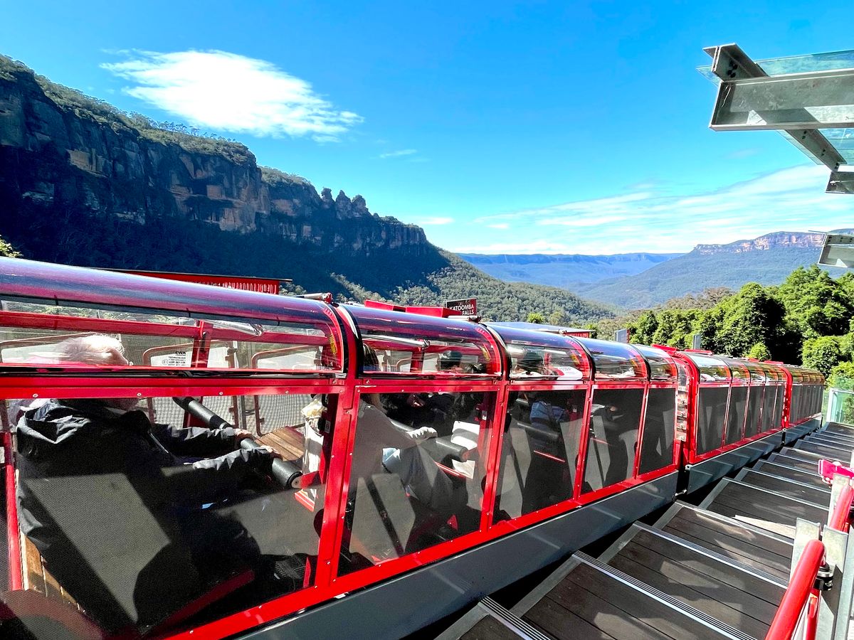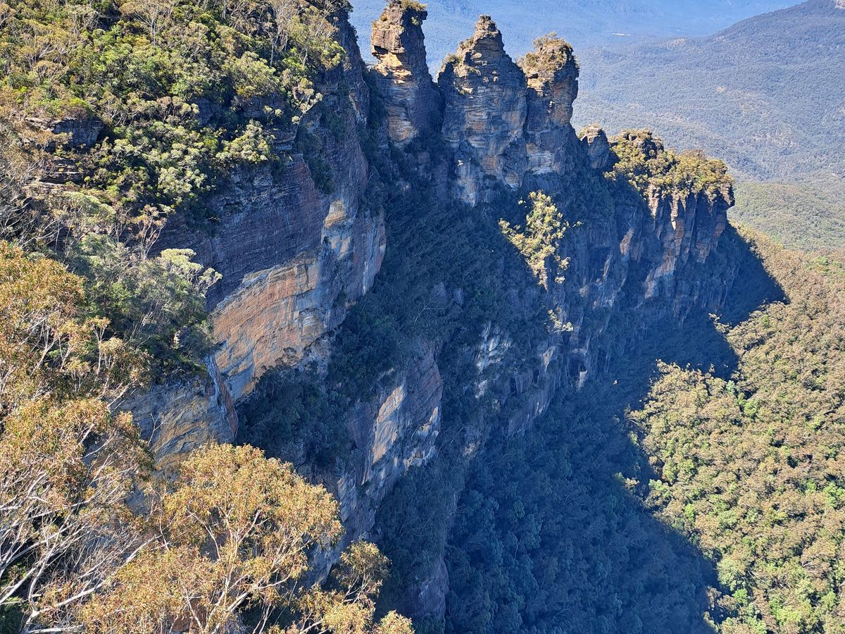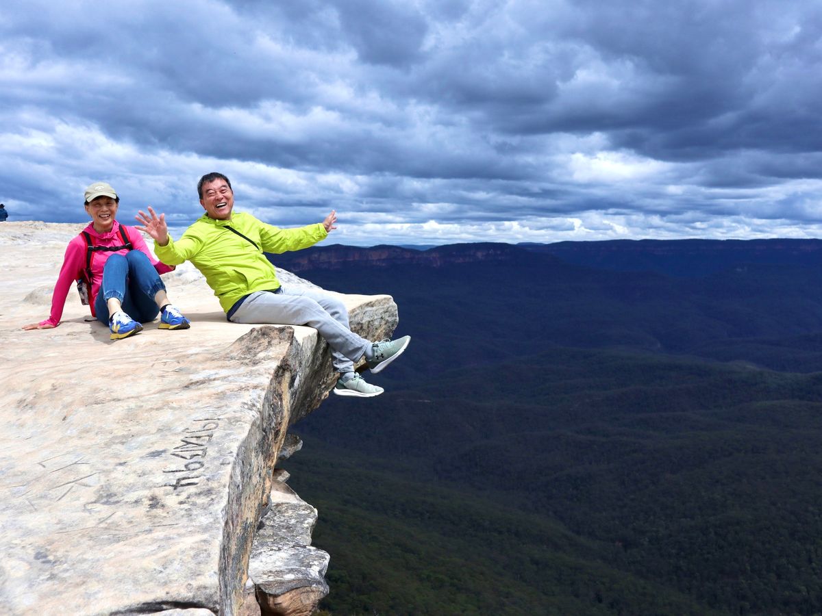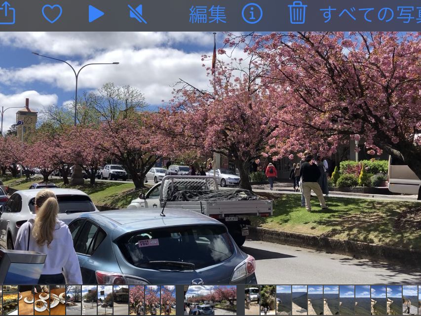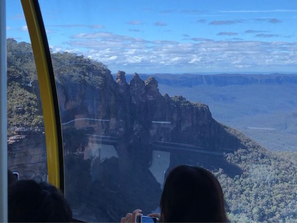 日本で見た天気予報では小雨混じりの曇り、最高15度、だったので、防寒具、雨具を準備していた。当日の予報は晴れたり曇ったり、となりセーターだけ着込んで参加した。現地に着くと日差しが眩しい快晴、まさにBlue Mountains! ガイドのMatthewさん曰く「私は天気予報信じません。だけど良かった」。12人ほど乗れるマイクロバスで送迎してくれたが、最終ピックアップのホテルで満席に。まず向かったのが、スリーシスターズを間近に見るエコーポイント。Matthew さんによる、他の部族の男たちと3姉妹の結婚を拒否した父親の悲劇の物語は秀逸。カンガルーはじめオーストラリア独特の言葉の語源説明もユーモア満点で面白い。シーニックワールドのスカイウエーから3姉妹がより近く見えると教えてくれたのも、うれしかつた。シーニックワールドで、谷間のウォークウェイ歩きはなんとも快かった。想定外だったのは、散策と食事をしたルーラの街に桜並木があり、満開に巡り合わせたこと。緋寒桜に似て濃いピンク色。最後にスリル満点の展望台、キングステーブルランドも案内してくれた。若い人たちには人気だったが、運動神経に不安のある高齢者としては、おっかなびっくりの撮影ポイントだった。