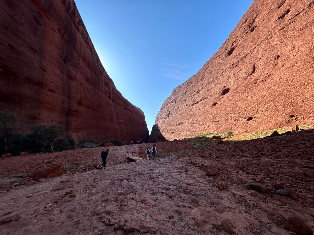 サンライズはウルルと日の出が綺麗に見える場所で、少しずつ変化するウルルの色を暖かい飲み物を飲みながら見ることができます。その後のカタジュタの散策はそこそこ歩きますが、自分のペースで行けるところまで歩いて戻っても大丈夫ですし、歩いた先の景色は最高です。赤茶色の岩と青い空のコントラストが美しくて何枚も写真を撮ってしまいました。
