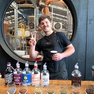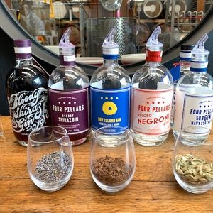 続いて2軒目のオークリッジワイナリーへ。ここも白と赤各3杯の6種類を試飲しましたが、吉田さんのお勧めで2杯のスパークリングも追加で試飲させていただき頂き大満足でした。各1軒での滞在時間にゆとりがあるので、じっくりと味わうことができました。そして3軒目は新しくできたジン工場「FOUR PILLARS」へ。4年前にできたそうで、まだ他のツアーでも知られていない穴場です!工場見学後の試飲か、試飲オンリーか尋ねられたので、試飲オンリーでお願いしました。広々とした工場兼ショップ兼BAR併設の明るい会場です。試飲会場から扉の奥にJINタンクなどが見えていました。少々混んでたので、3種のジンをトニックで割って味わいながら時間待ち。試飲カウンターへは他の外国人客と共に集合し説明を聞きながら5種類のジンを原酒で味わいました。ジンとは、製造工程で様々なスパイスやハーブなどの「ボタニカル」を加えて蒸留させてできるお酒です。アルコール度数が37度から58度くらいまであるので、舌の先に乗せて10秒くらい待って余韻を楽しむんだとか。外国人客は結構飲んでましたが、アルコール度数が高いので私達は舌で感じる程度にたしなみました。
