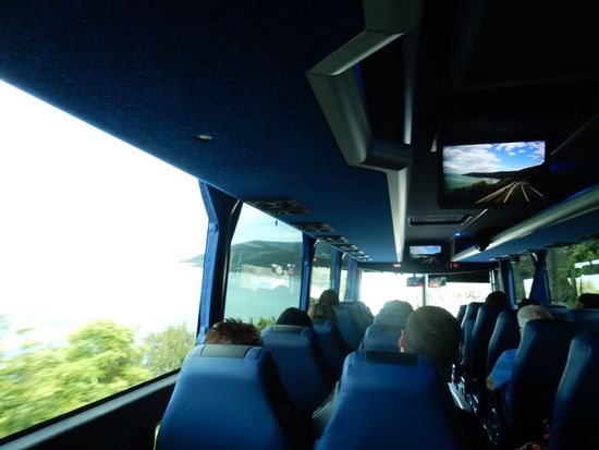 バスは、口コミの指示通りに、左側に席を取りましたが、予備知識のない参加者も結構おられますので、左側の競争率が高い、ということもなかったです。前の方は埋まっていましたので、中間ドアのすぐ後ろを取りましたが、すぐ前の視界が開けていてよかったです。一応、社内にモニターがあり、バスの走行中は先頭の車載カメラの映像が見られます。