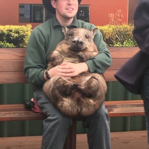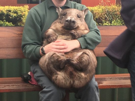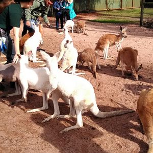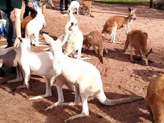 1台のバスでホテルを周り参加者のピックアップが終わると、いったんADAMS社の集合場所に集合しそこで他のバスと合流後、それぞれのツアーのバスに乗り換えます。ツアー参加客の振り分けが終わるとまずカバシャムワイルドパークに向かいます。途中、有名なスワンバレーを通過するので、運転手さんが英語で説明をしてくれます。園内では45分の見学と15分のトイレ&土産タイムで計1時間の滞在でした。見学は15分毎×3種類で、グループごとに1)カンガルーの餌付け 2)ウォンバットとの記念撮影 3)コアラとの記念写真(抱っこはできません)を行います。カンガルーはまだ子供のようで体は小さいですが、園のガイドさんからエサを手渡しでもらった瞬間一斉に寄ってきます。ウォンバッドはスタッフの男性がウォンバッドを抱っこした状態でベンチに座っており、一人ずつその隣りに座って記念撮影をする、という形式です。ほぼ流れ作業でした。コアラ撮影も同様、一人ずつ並んで記念写真を取りますが、木に座っている1頭のコアラの横に立ち写真をとりました。