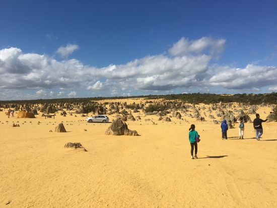 メインはなんといっても西オーストラリアの景勝地ナンバン国立公園にあるピナクルスだ。広い砂漠の中に無数の自然が作り上げた石の彫刻たちが立ち並ぶ。広い敷地を自由に歩くことができるので、子供たちは大喜びで岩石の間を駆け回った。石に上ったりしてはいけないが、触ることはできるので、面白い形の石を見つけてはのぞいたり、たたいたりして、太古の自然が作り上げた世にも奇妙な数々の石を堪能したようだ。島国で生まれ育った私たちが、広大なオーストラリア大陸に立っているという感覚を肌で味わえた。