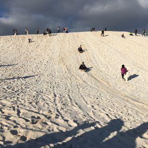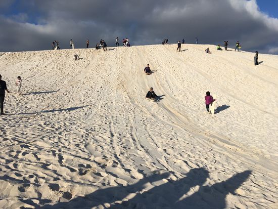 ツアーではハイライトともうたわれているランセリ大砂丘、4WDのサンドドライブツアーはダイナミックに砂丘を走りぬけるだけでなく、砂丘のど真ん中で真っ白な砂の大地がオレンジ色に染まっていくサンセットを楽しむことができる。(ただし1歳の娘は安全上参加できず。)さらにサンドボーデイングはすぐにコツをつかめるので9歳の娘もボードを上手に乗りこなして40メートルほどの斜面を叫びながら滑り下りていた。ちなみにおしりでのすべりなのでそれほど怖くはなく、さら自信がある人は立ってすべりおりてもOKだ。汚れてもよい服で臨むことをお勧めしたい。ここでの体験はおそらくツアーに参加しないと難しいのではないだろうか。