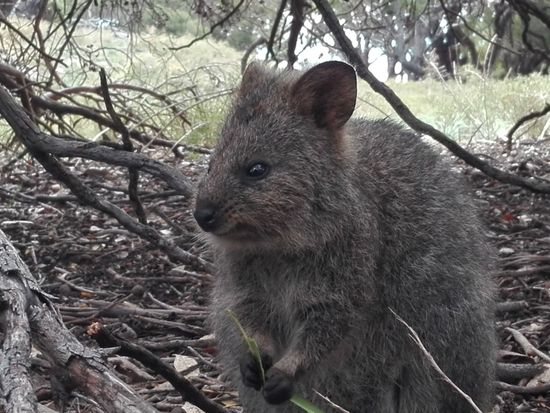 クオッカは島のあちこちで見られましたが、ただ、ガイドさん曰く、普段は葉っぱなどを見せると自然と集まってくるらしいのですが、私達が行った日はクオッカはあまり寄って来てくれませんでした。クオッカがあまり葉っぱに興味を示さなかったので、道に落ちていたオリーブのような実を差し出したら寄ってきてくれました。クオッカは警戒心が低く、間近で見ることが出来ます。自由行動は1時間ありましたが、クオッカを夢中(必死?)で撮影していたらあっという間に過ぎてしまいました。