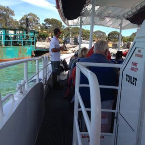 まずは、島までフェリーに乗って行きます。行きのフェリーでは、スワンリバーから見える観光名所の説明をガイドさんがしていました。座席は早い者勝ちなので、早めに乗船していい眺めの座席を選ぶことをお勧めします。フェリー内にはバーの設備もあり、飲食が可能でした。ツアー内容ではモーニングティー・アフタヌーンティーのサービスがあるとの事でしたが、その説明はなく結局受けられませんでした。(説明を聞き逃していたのかもしれませんが…分かりにくかったです。)川から海に出ると、船が結構揺れるので、酔いやすい方は酔い止めを服用した方がいいと思います。