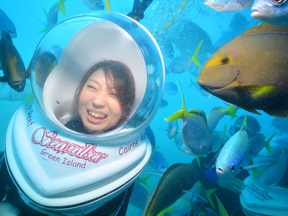 グリーン島におけるアトラクションとして、ダイビングは家内がやらない、と言ったのでシーウォーカーを選択しました。耳抜きに不安がある家内もインストラクターに励まされなんとか水中に降りましたが、50cmを超える無数の魚に囲まれて水中散歩を楽しみました。防水カメラは持って入ることはできなかったので、写真はUSBで買いました。