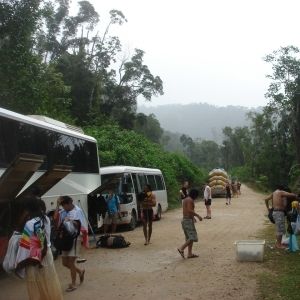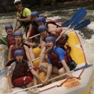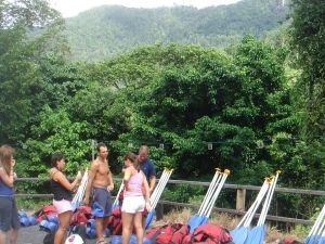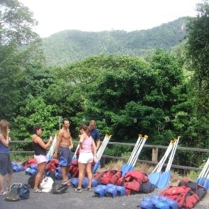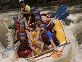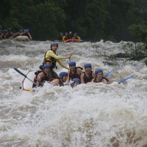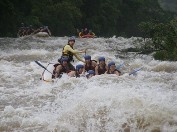 参加者は想像以上に多く、韓国人の客が多かったです。ガイドは日本人でとてもテンションが高く、行きのバスでは朝早かったためか、客はみな引いていました(笑)。1グループ5、6人。最初に自己紹介をし、ラフティングについての簡単な説明がありました。初心者の為、激流をゴムボードで下る事に最初不安があり、こんな簡単な説明で終わっていいのかと驚きました。川に出ると、ガイドが1人後ろで一生懸命舵を取ってくれるので、私達は意外に簡単ですぐに慣れました。ボートがひっくり返るのも楽しく、全く恐怖感はありませんでしたし、激流でも各箇所にレスキュー隊がいたので安心です。周りを見渡せば、亜熱帯雨林のすばらしい緑の中にいて、すごく贅沢な気分になりました。晴れているかと思えば、突然のスコールがありそれがまた亜熱帯雨林らしく大変良かったです。お昼は、ハンバーガーで自分達で具を挟み食べましたが、それがすごっくおいしくて満足でした。午前と午後ラフティングをしましたが、あっという間でまだまだ続けたかったです。最後には仲間意識が芽生え、今日初めて会った人達ではないようで不思議でした。見事に、ラフティングにはまりました★