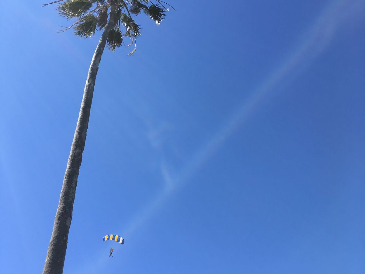 これでもかってくらい最高のお天気の日。海も空も真っ青。空を仰ぎパラシュートを眺めながら自分の順番を待ち、いざ!