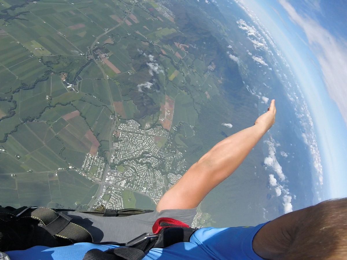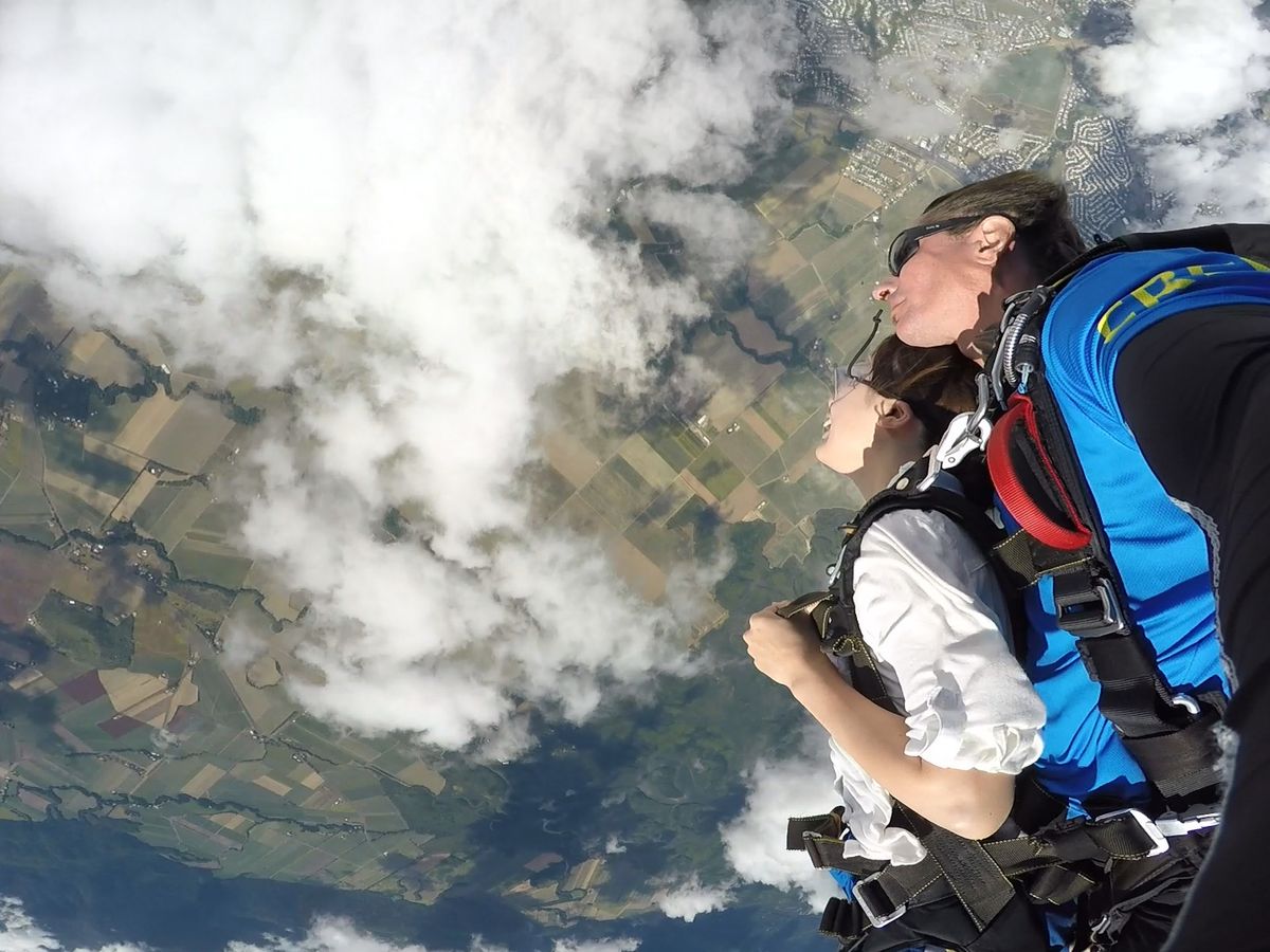直前までは、どんな感じなのだろうとワクワクしかしていませんでした。いざ飛行機?に乗ると、小さくて狭い割に出入り口が大きくて、ココから飛び出すんだとドキドキし始めました。乗る前には、ビデオを見たり、担当のインストラクターが飛び出し方、着地の仕方を端的にレクチャーしてくれます。予定の高度に達すると、あっという間に皆飛び出して行き、インストラクターの方に身を任せた隙にわたしも空中へ。余りにも高かったので、落ちている感覚は視覚的には思った程ありませんでしたが、やはり少し恐怖はあり、風の圧力でスピードも感じていました。パラシュートを開いてからは余裕を持って景色を見渡せました。とてもキレイでした。スカイダイビングは、ずっとしてみたかった事の一つなので、経験できて良かったです。インストラクターさんありがとうございました。わたしは写真、ビデオ共に購入したので、また見返してみたいと思います。