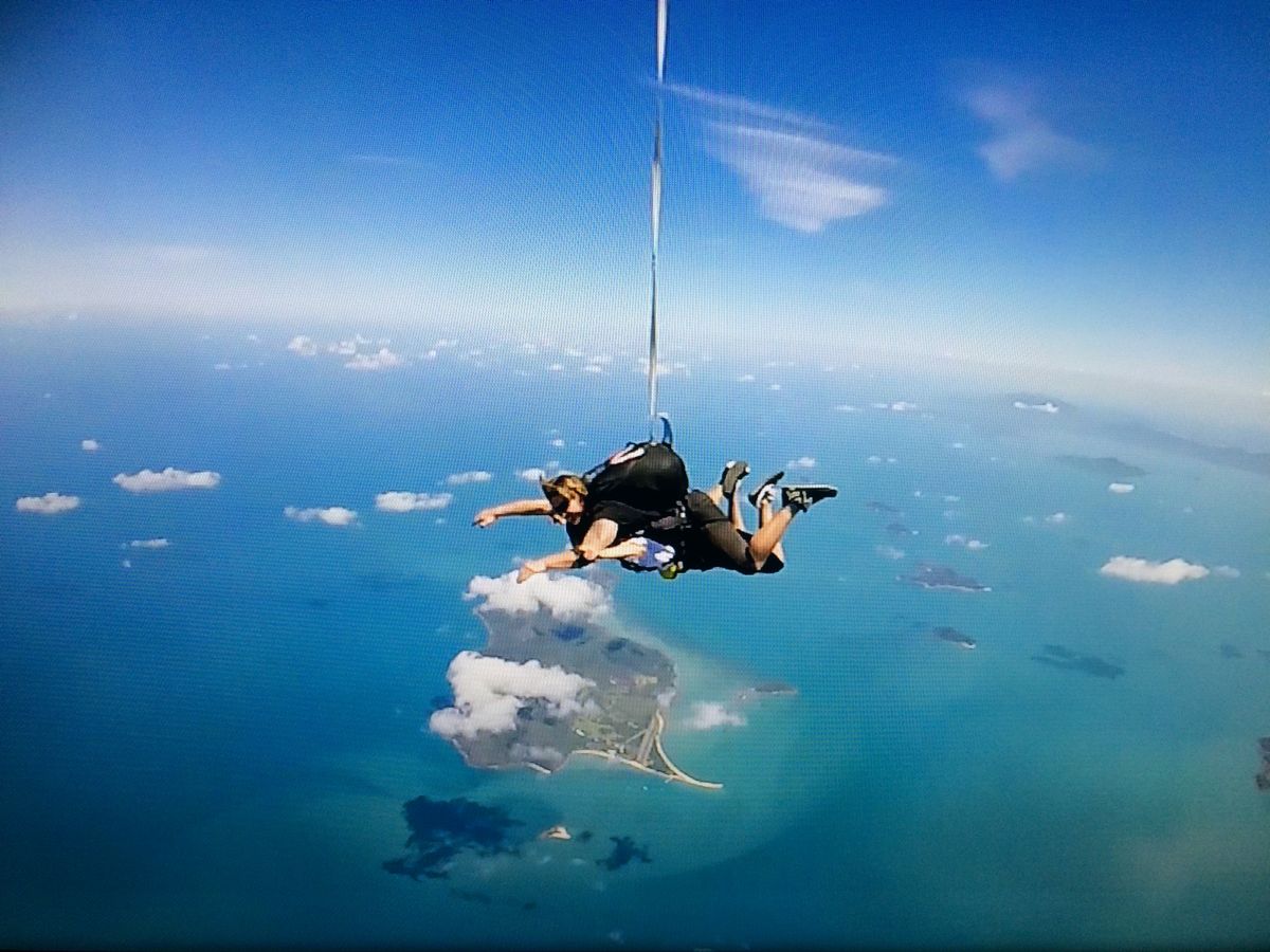 さて本題のスカイダイビングは、今までに経験したことのないものすごい体験でした。セスナが上昇してダイビングポイントから見たケアンズの海山の美しい景色は一生忘れません。飛び降りる時少し勇気が要りますが飛んでしまえば不思議な位怖くありません。