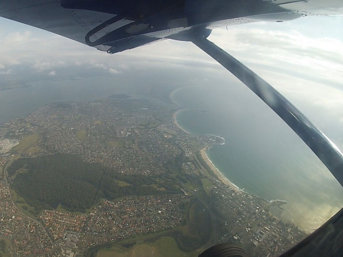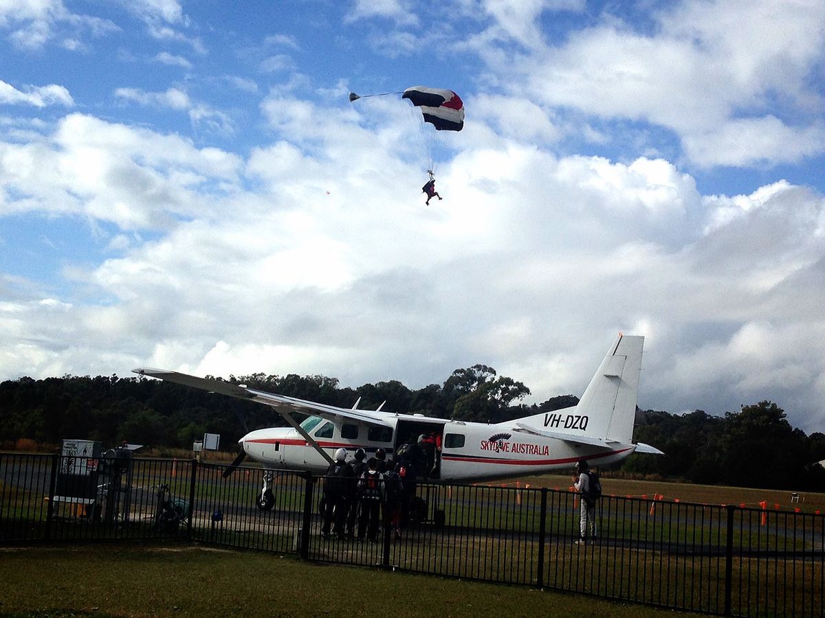 色々なロープやベルトなどを装着して、簡単に説明をされ小型のヘリに乗り、私は一番最後に乗ったので窓側でした。窓といっても薄いビニールのカーテンのようなものなのでものすごく怖かったです。上昇し海の上を飛んでる時クジラやイルカを見ることができました。ヘリの入り口側は怖いですが一番いいポジションです。飛ぶ準備ができゴーグルを付け窓が開き、当然入り口側なので一番初めに飛びました。ヘリから出たすぐはジェットコースターのような感覚で、5秒くらいで、その感覚は消え恐怖などもなく、ポージングできるまで余裕でした。すぐにパラシュートが開きパラシュートでコントロールしたりして遊んでました。空の上から見るバイロンベイはすごく綺麗で涙が出そうでした。スカイダイビングは、人生で1度はしたほうがいいと思います。