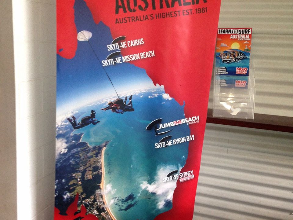 スカイダイビングは楽しく大満足ですが、お国柄なのかその他の時間調整がルーズです。ホテル出発6:00→現地到着7:30→受付に1時間くらい(一人一人の対応がながいので時間がかかる)→11:30ダイビング(モニターに飛ぶ順番に名前が表示されます)→12:00ダイビング終了→14:30バイロンベイへ出発→15:00バイロンベイ散策→16:00バイロンベイ出発→17:00ホテル着