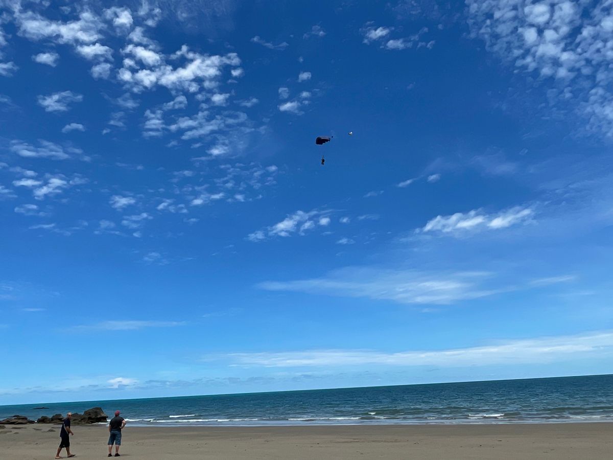待機中に爆音が聞こえ上空を見上げてみると飛行機が見える。その飛行機が飛び去ってしばらくすると突然色とりどりのパラシュートが7つ咲いた。ゆらゆら揺れながら次第に大きくなってきて無事着地。