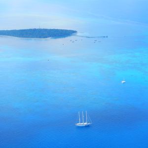 上空からはケアンズの街並みが見渡せます。そして、ケアンズの町を離れるにつれ、海がどんどん濃いブルーになっていきます。まず、グリーン島が見えてきます。滞在中にグリーン島に行きましたが、上空から見る方が断然きれいです。グリーン島に向かう船も見ることができます。サンゴ礁に白い砂、どこまでも広がる青い海に圧倒され、ずっと見ていたい、そんな気持ちになります。