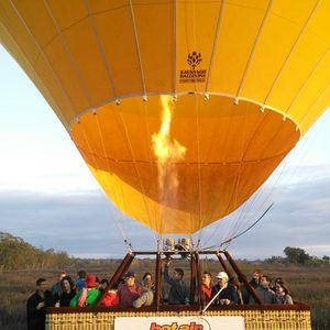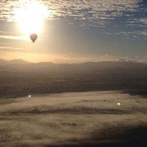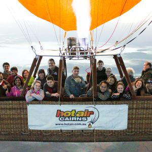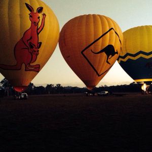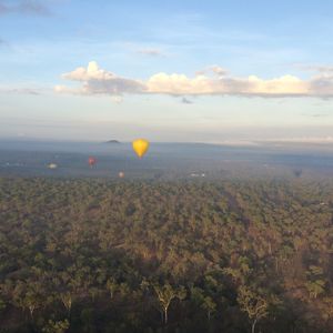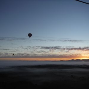 夜明け前からの期待感を裏切らない素敵な飛行体験です。ケアンズの方角の山々から日の出が見られるはずでしたが、あいにくその辺りにだけ雲がかかっていて見えませんでした。でも雲間から漏れる朝日が非常に美しく、あちこちに飛んでる熱気球と、山火事の影響のうす煙にかすむ地上の緑とが相まって、何とも言えない風景を堪能できました。空気を温めるバーナーのゴォーという音が時折するだけで、飛ぶ前も離陸も飛行中もただただ静かです。思った以上にバーナーの熱が感じられて、8歳と5歳の子供たちは暑い暑いとバスケットの底にしゃがんでいました。11歳のほうは大人と同様に楽しんでいました。子供たちには着陸時のバウンドが面白かったようです。パイロットの説明によると、どこに飛んでいくかは本当に風任せで、同じ時に離陸した気球でも捕まえる風によってはより遠くに飛んだり、思いのほか早くに着陸したりするようです。60分フライトを申込み、前半で日の出を、後半で走っているカンガルーを見つけたいと期待していましたが、残念ながらカンガルーには遭遇せず、その点で星ひとつマイナスです。が、これは風任せ、運任せの要素ですから実質大満足のレベルです。このケアンズ郊外の熱気球体験は他の場所での体験よりもすばらしいと同乗した外国人の方が言っていましたし、ぜひ乗ってみてくださいと私たちもお勧めします。最後の熱気球パッキングもとっても楽しかったです。450kgのバルーンもみんなでたためば何とかなるっていう調子でよいしょ、よいしょと体を動かします。これがかなりの重労働のため年中暑いこの地域では早朝しかできないとのことでした。納得です。