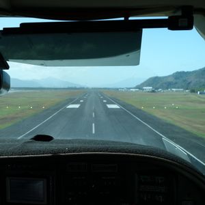 時間どうりにピックアップ、なんと、飛行機の搭乗人数の関係で45分コースにグレードアップしてもらえました。ケアンズ空港に到着!冷房の利いてない待合室で体重測定、飛行ルートの確認などをして、搭乗!!