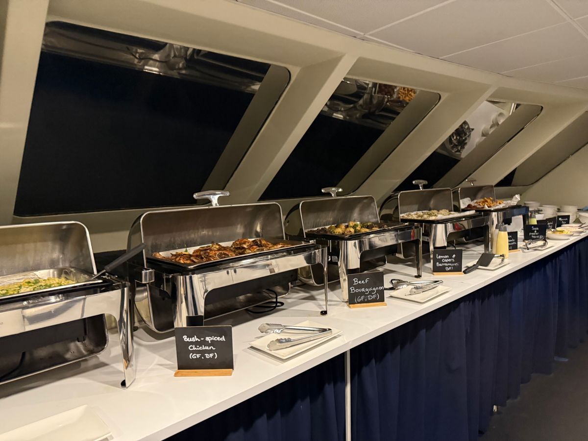 ドレスコードはスマートカジュアルということでしたが、ジーパンやスニーカーの方もいらっしゃったので、服装はあまり気にしなくていい気がします。また、船酔いがひどい私でも全く酔いませんでした!