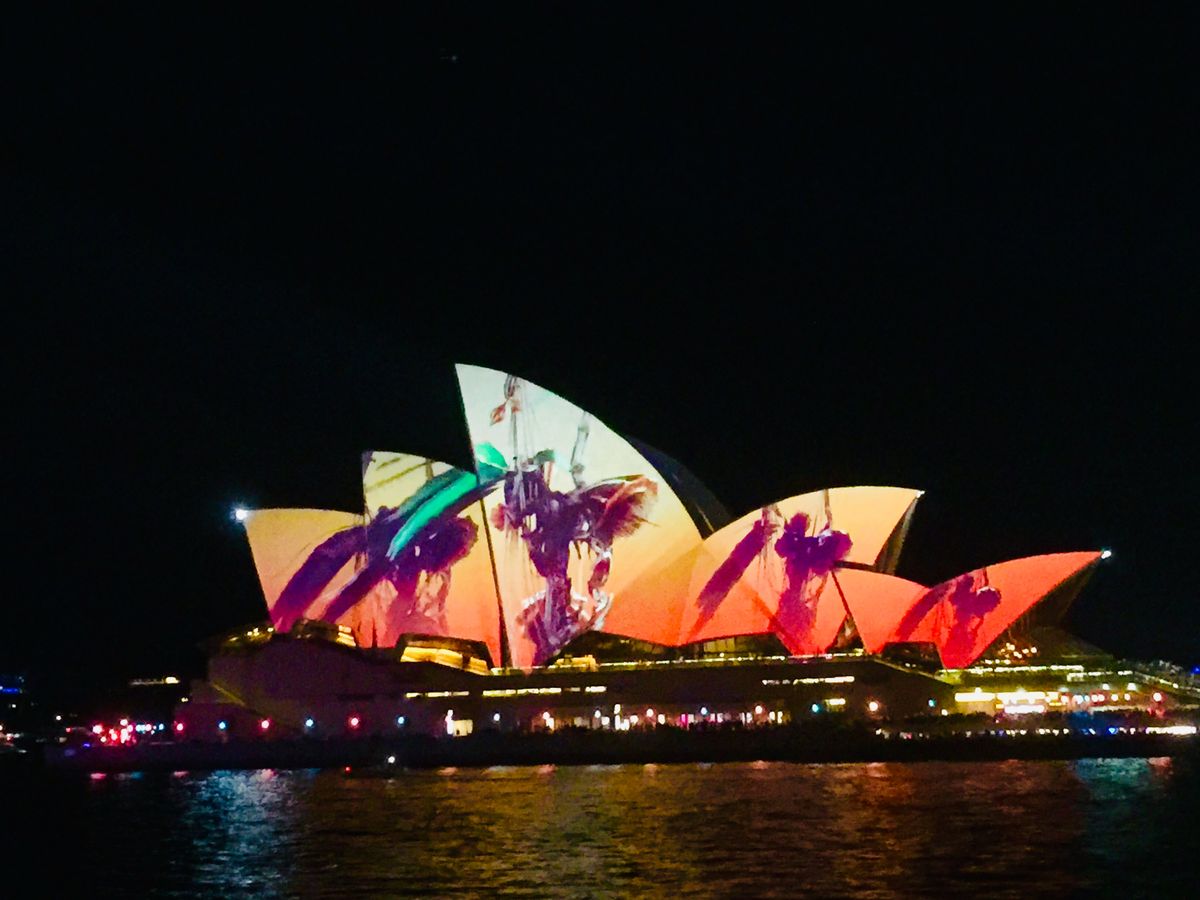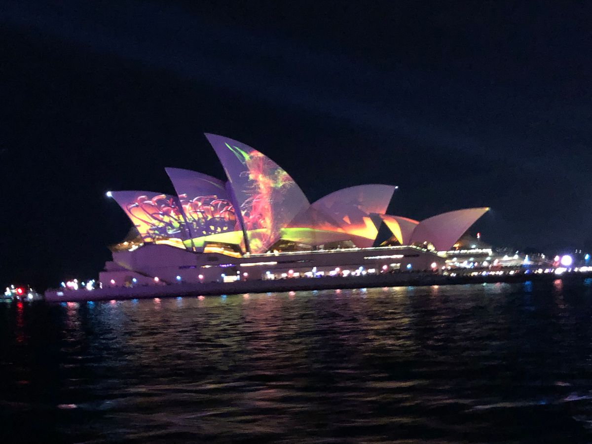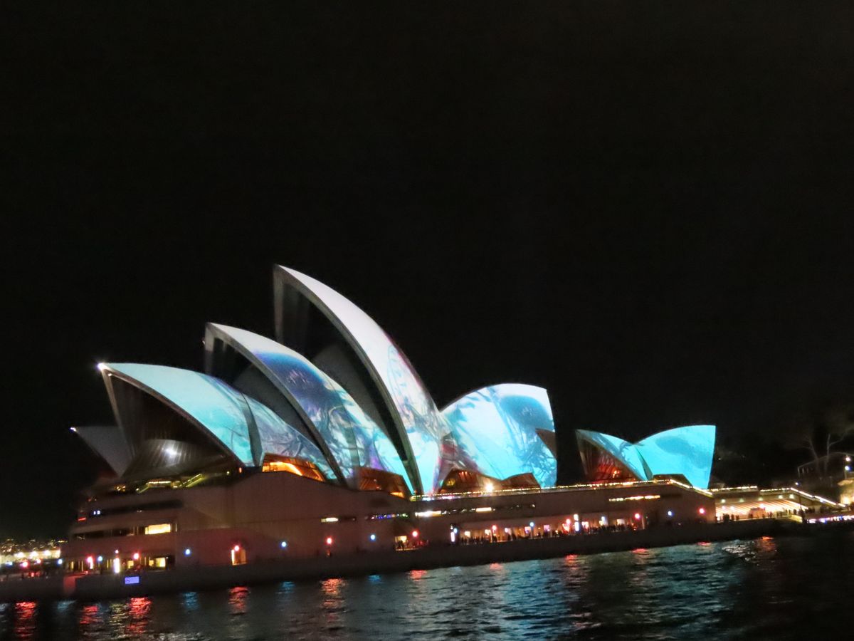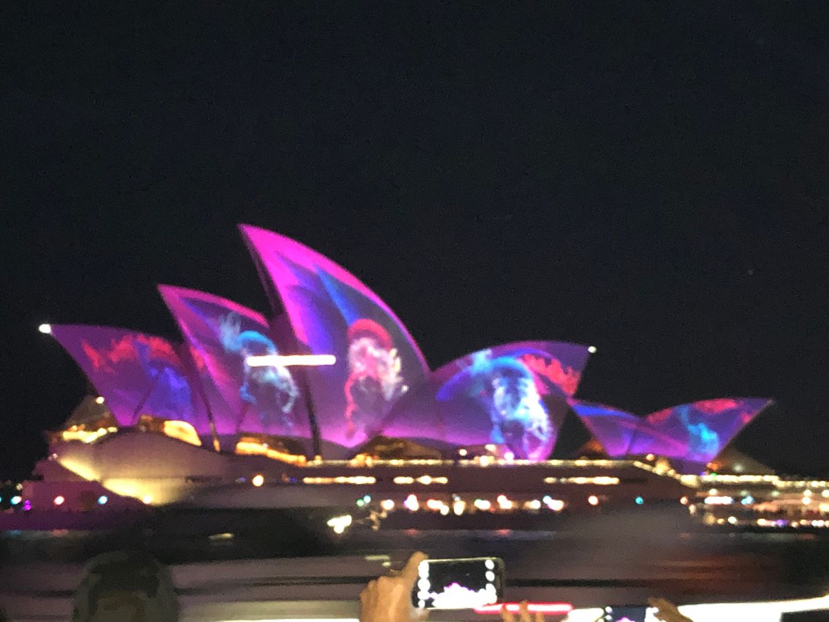 あいにくの悪天候でしたが、乗船の頃には小雨になり、外で写真も撮れました。後日、陸からビビッドシドニーを眺めましたが、やはり船からの眺めの方が良かったです。雨に濡れたライトアップも美しかった。