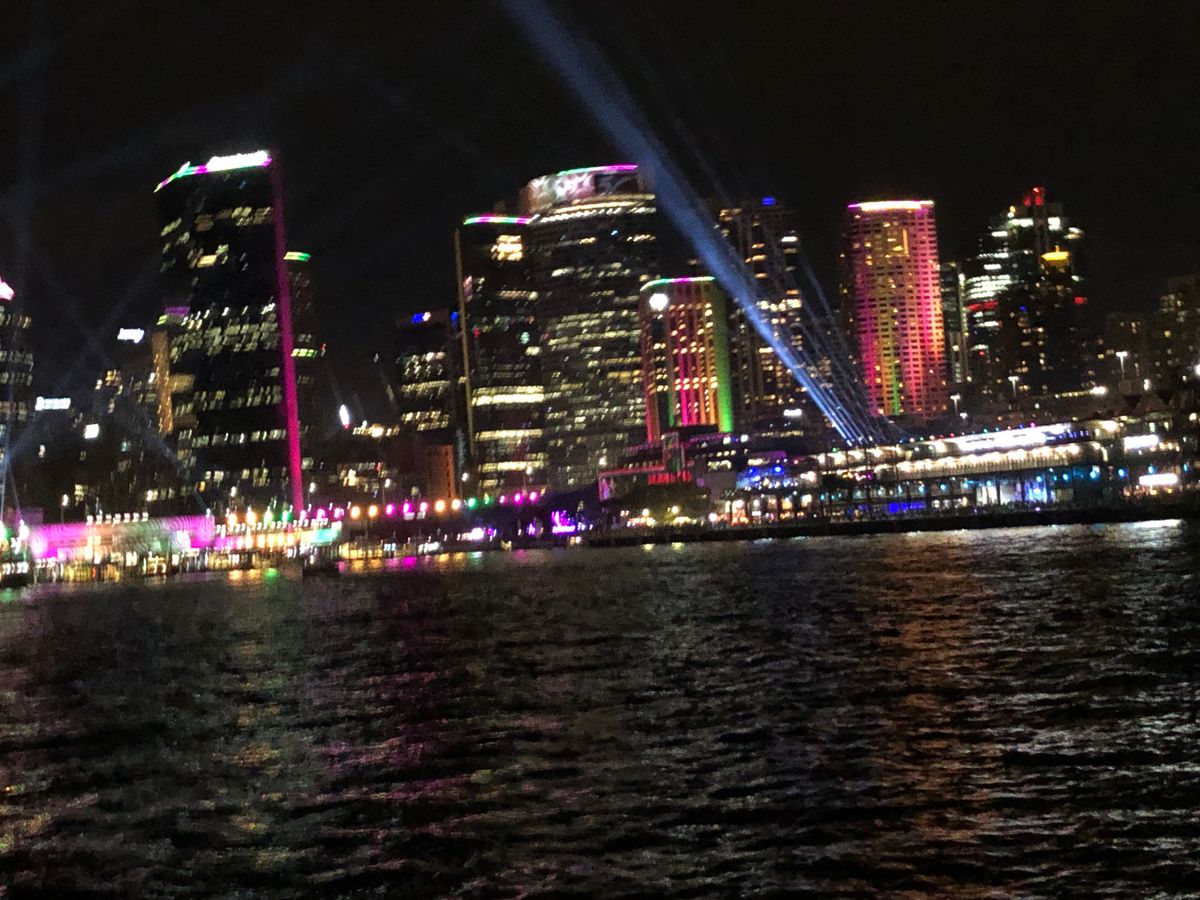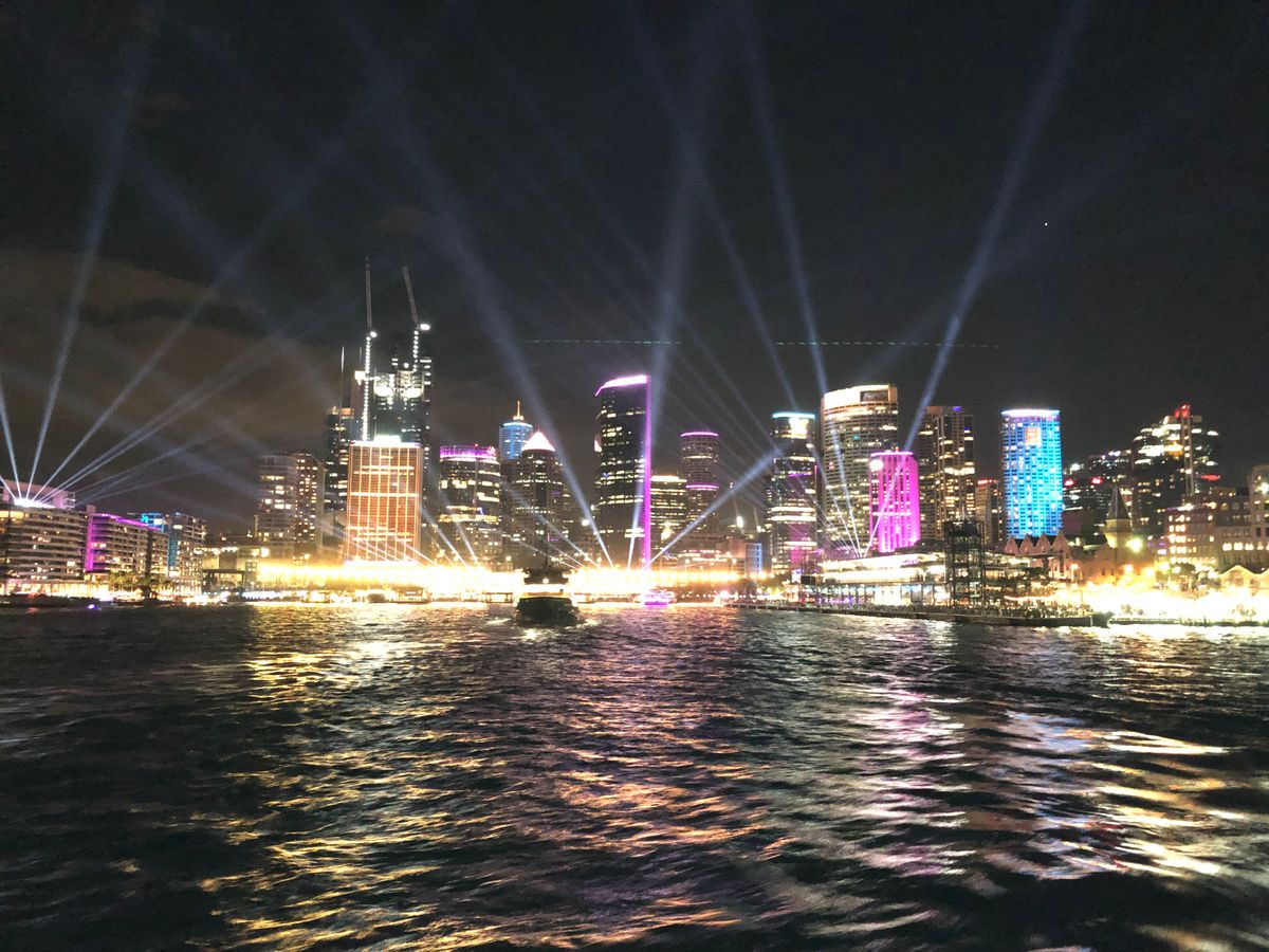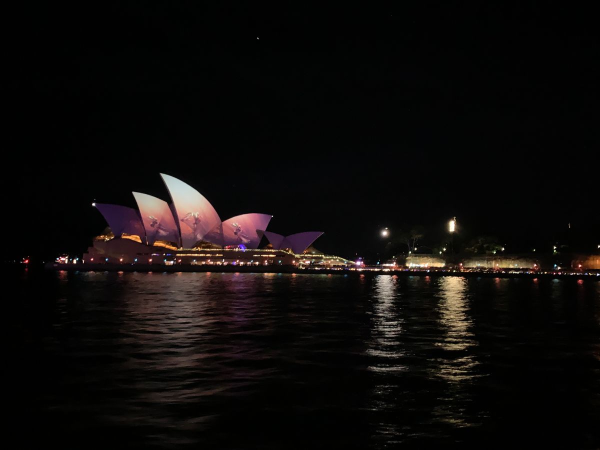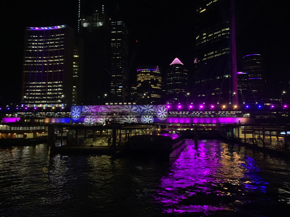 Vivid sydneyでライトアップされたサーキュラーキー、オペラハウスを海側から鑑賞。キラキラの街がとても印象的でとても良かった。食事付きのプランもいいかと思いますが、お得だし短時間で目的を達成できるしとおすすめです。