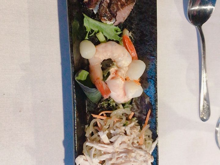 鶏胸肉・サーモン共にしっとりと仕上がっており、ヘルシーながらも満足できました。白ワインをサーブしていただきました。