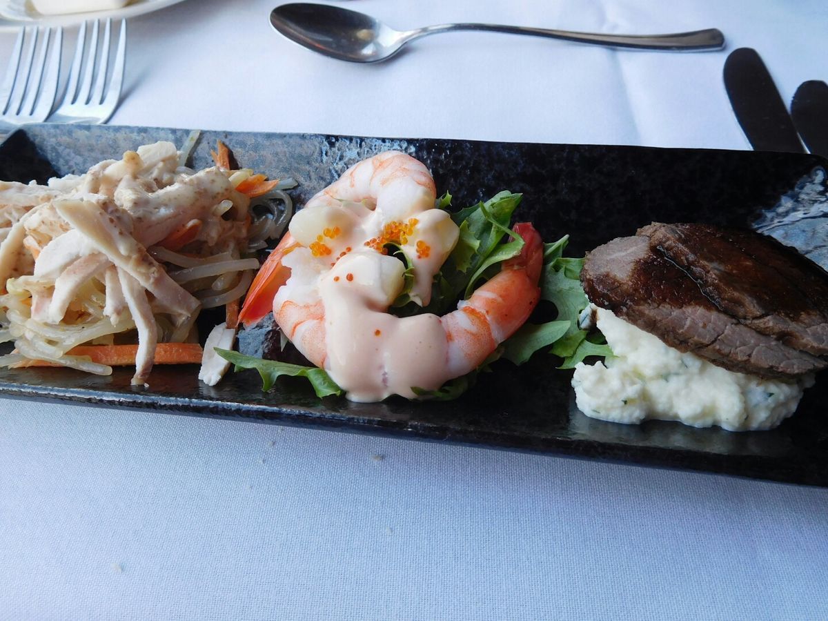 席に着くとすぐにパンと飲み物が運ばれてきました。ほとんどの人がシャンパンをオーダーしているようでした。出航後すぐに料理が運ばれできました。前菜もメインディッシュも美味しかったです。