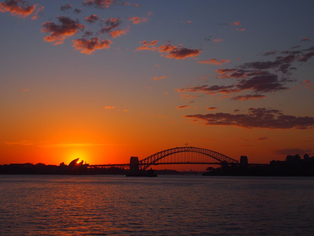 コメントありがとうございます。ハーバーブリッジとオペラハウスの間に沈む夕日が絵葉書のように美しいですね。
