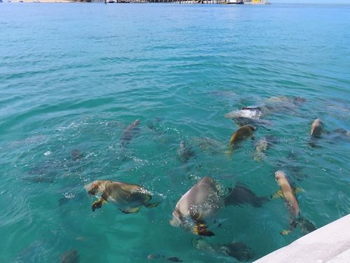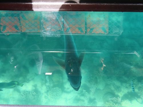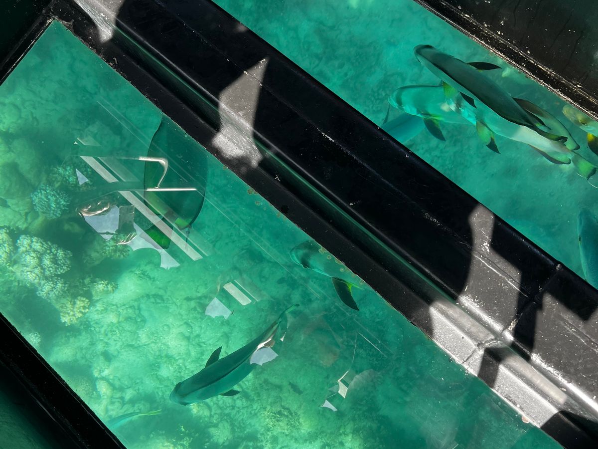 ロッカーに荷物を入れて指定されたグラスボートに乗りました。船底がガラス張りで海中の様子が見えますが、魚を集めるために餌をまいているので、多くの魚が集まってきて楽しかったです。