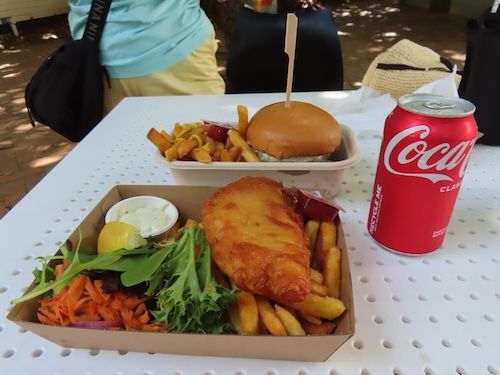 下船して昼食はハンバーガーとフィッシュ&チップスを購入して、2人でシャアして食べました。