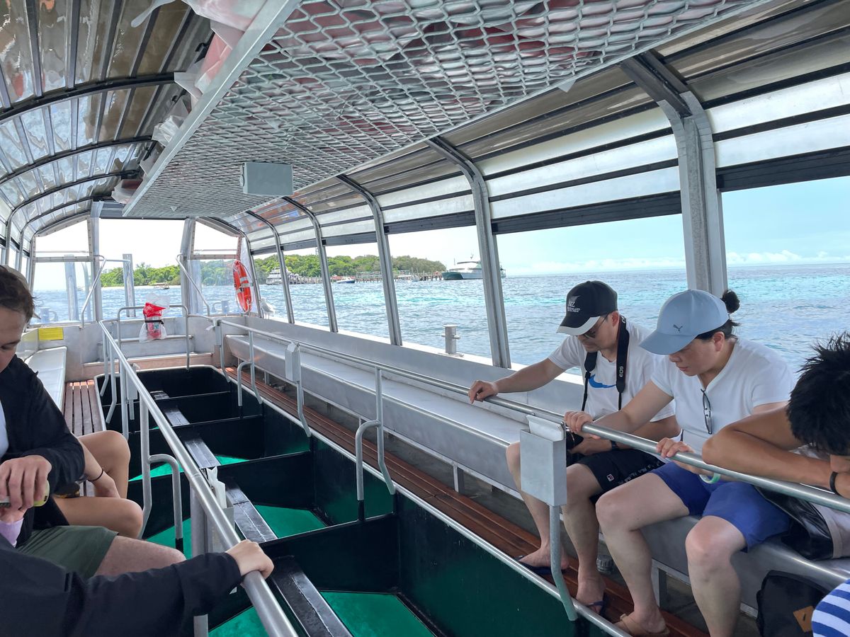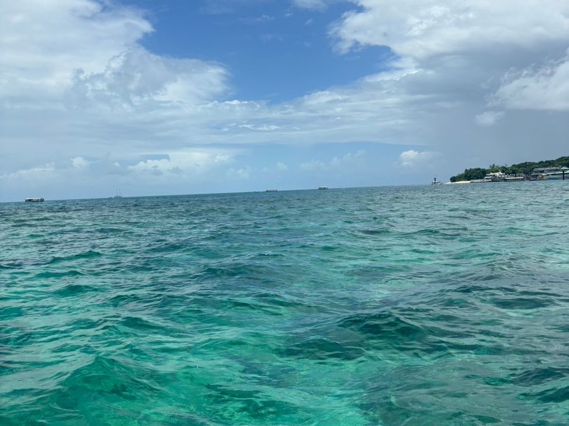 雨季ということもあり、ケアンズ市内を発つ時にもすでに雲行きが怪しく、、。到着するも空は一面雲に覆われ雨も激しい中上陸。大雨の中グラスボトムボートに乗りましたが、それでも思ったよりも綺麗に珊瑚礁が見えウミガメも1匹見ることができました!