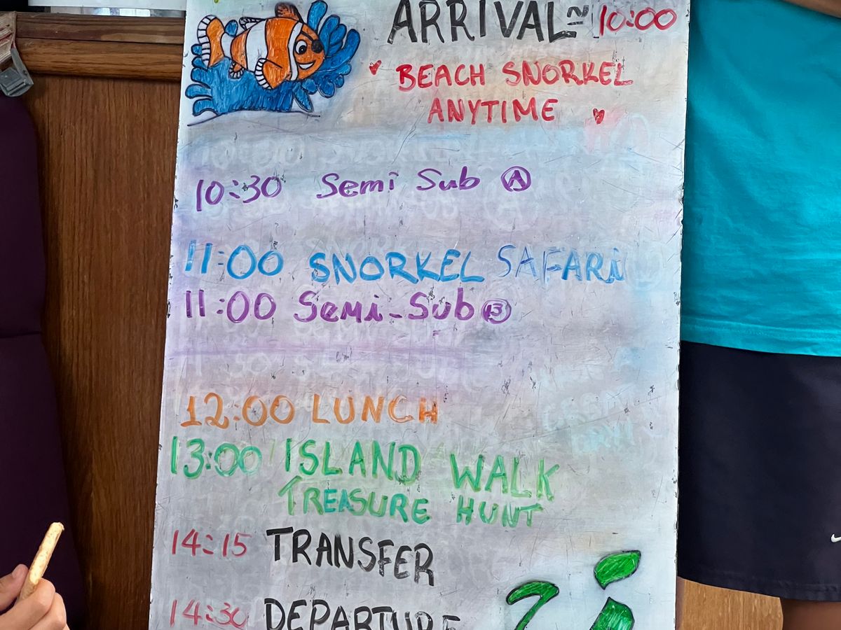船でも島についてからも日本人に向けて詳しく説明してくれました!!船では、シュノーケリングのフィッテングをしてサービスのコーヒーとクッキーをいただきました。