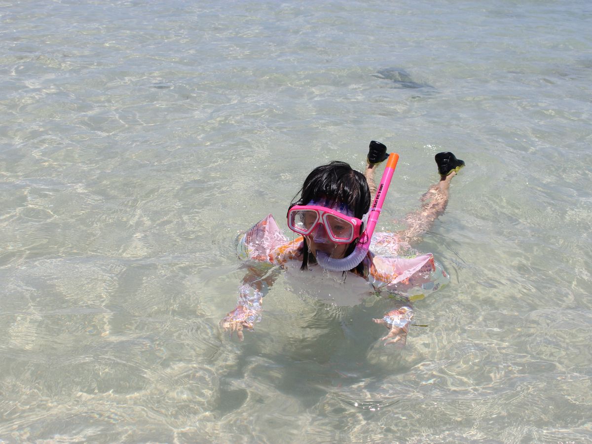 子供は3coinsのアームリングとシュノーケルセット、親はゴーグルで泳ぎましたが、お魚がいっぱいいて感動。子供も大喜びで、ずっと潜っていました。