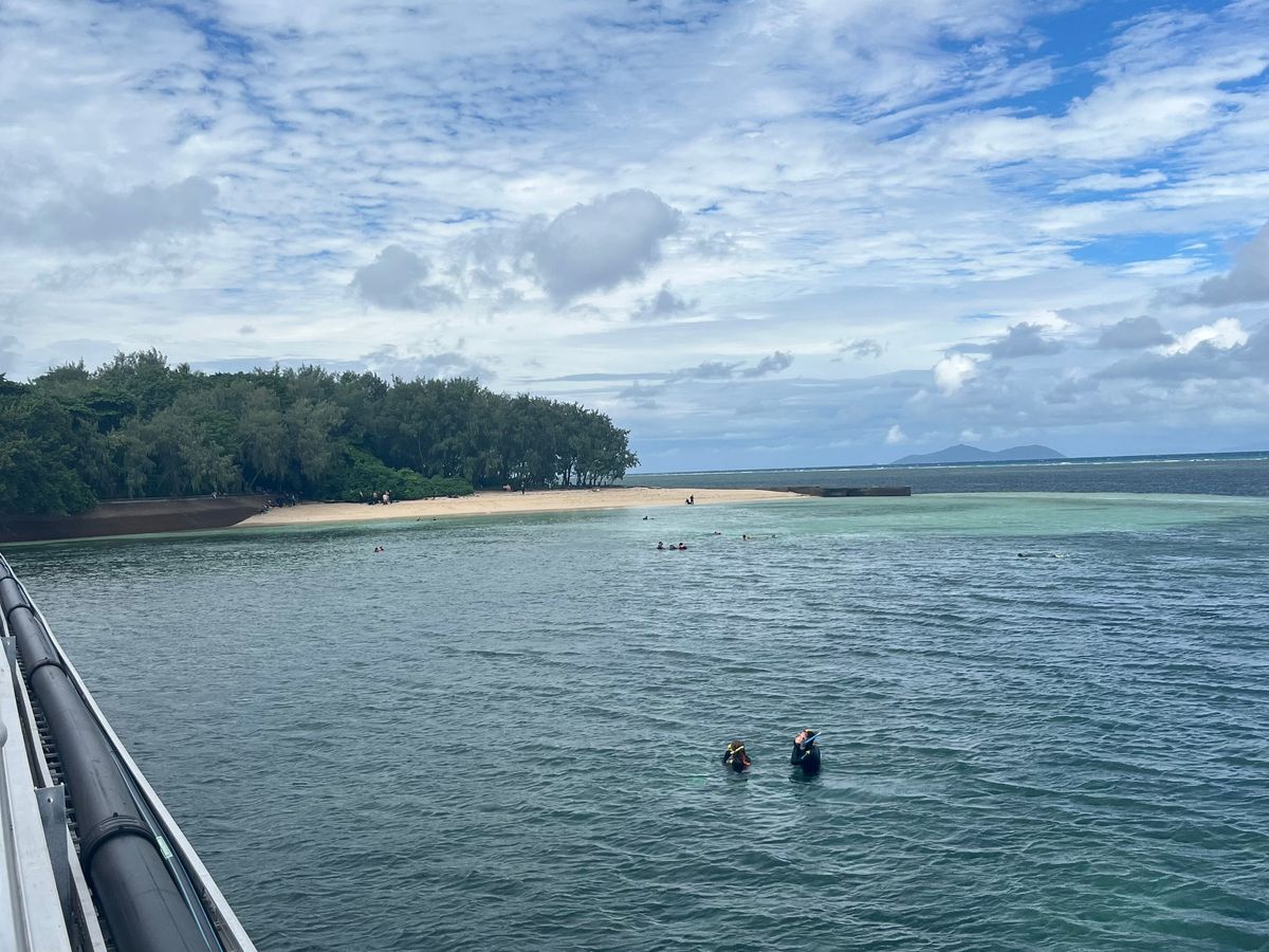 私達が参加する日が2月ということで豪雨がとっても心配でした。グリーン島は、本島から少し離れているので、天気が違うから晴れるだろうと思っていましたが、島についてもものすごい大雨でカッパを買うくらい雨が降ってました。ですが、1日の間で天気が何回も変わるので、一瞬だけ晴れる時がありました!私たちはシュノーケリングをしましたが、お魚達にいっぱい会えて、とっても楽しかったです!!