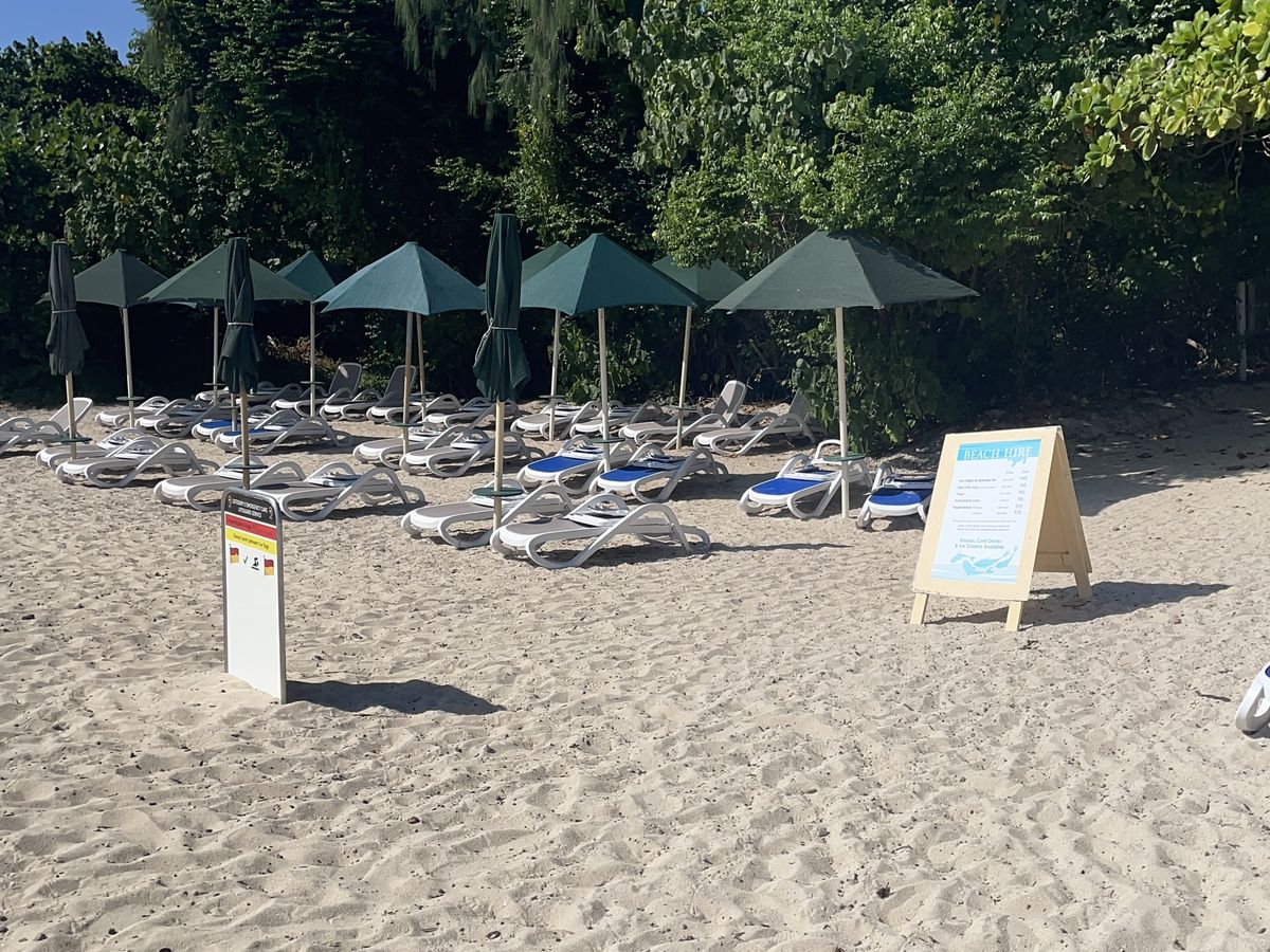 管理されているビーチでは40ドルでイスとパラソルが借りられます