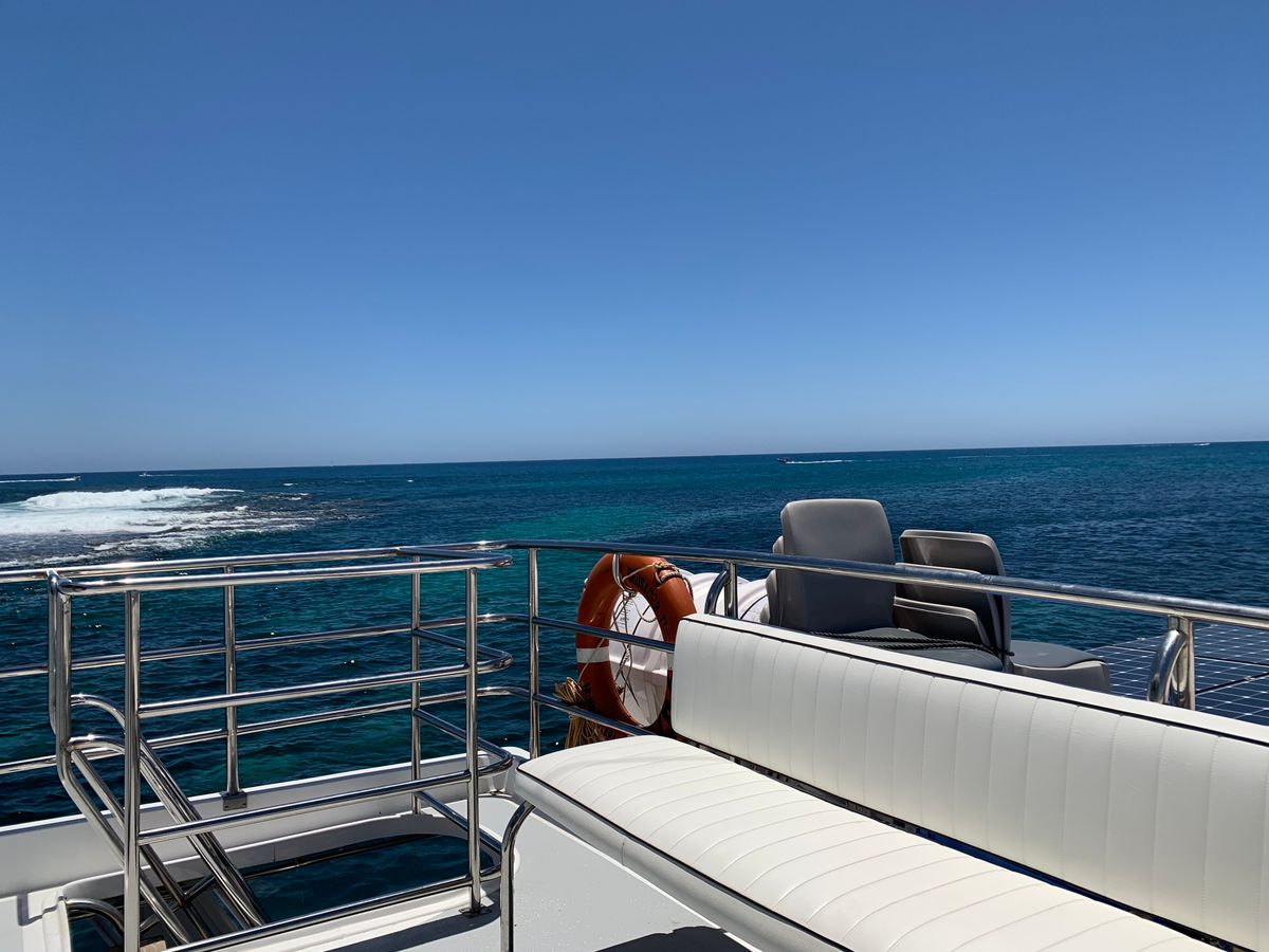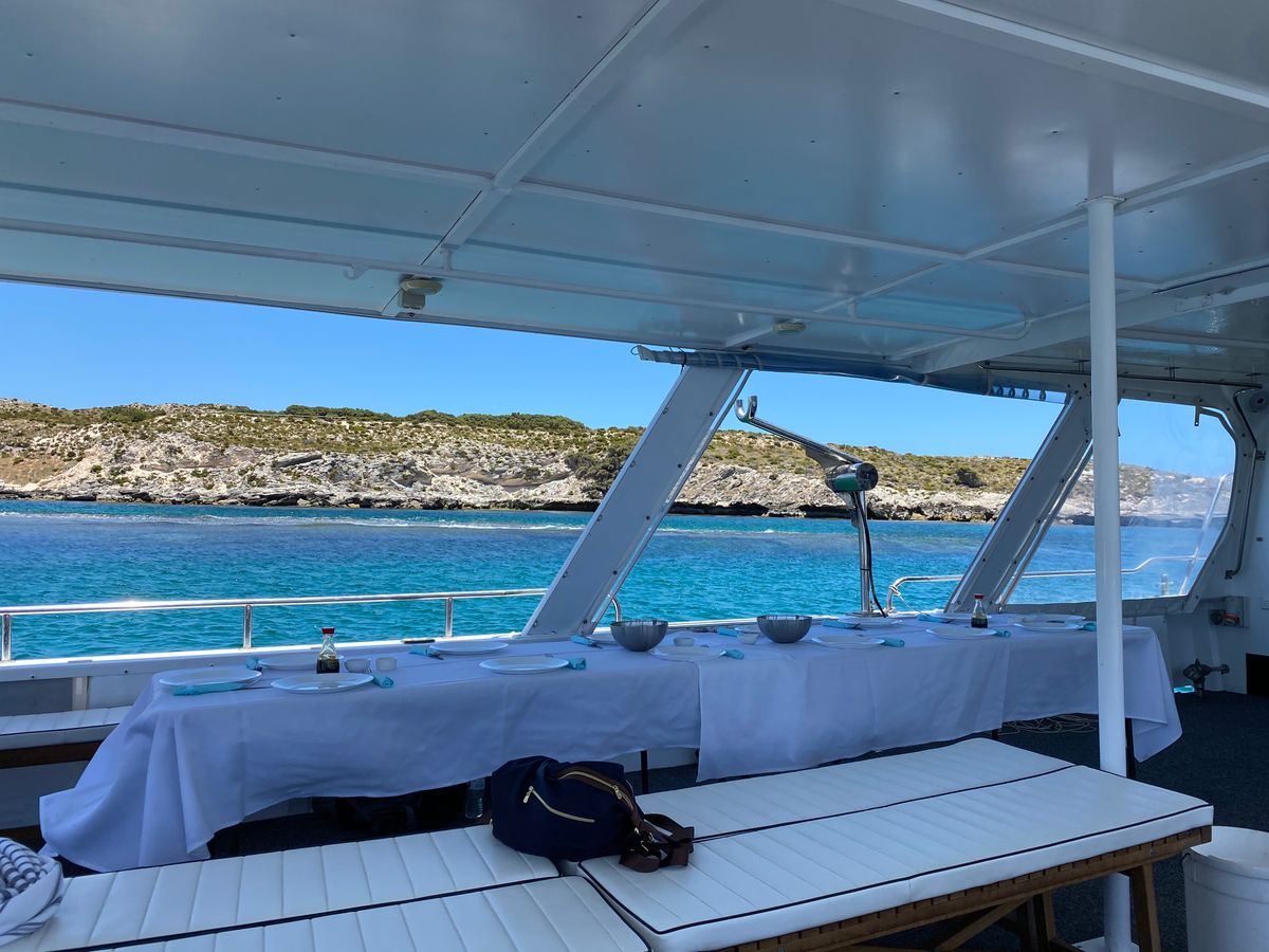 パースのエリザベスキーからフェリーに乗りロットネスト島へ。フェリーでは最上階のテラス席に座ったので、風を感じながら美しい景色を楽しむことができました。フェリーの進む方向によって、日差しが直接当たり暑かったのですが、影になるとかなり肌寒く感じるので、温度調節ができる服装が必要です。ロットネスト島についた時刻が予定よりも遅れていたため、シーフードクルーズの船を探す時間がなく、また、目印や看板もないため、自力で船を見つけましたが、時間はギリギリ間に合いました。他の乗客はすでに乗船していたので、到着がもう少し遅ければ置いていかれていたかもしれません。