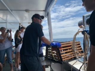 全10名の参加でしたが捕獲体験は最初に指名されてワクワク!しながらクルーの指示通りにロープを引き、仕掛けてあった木製カゴを引き揚げましたが、、、結果はスカ!
