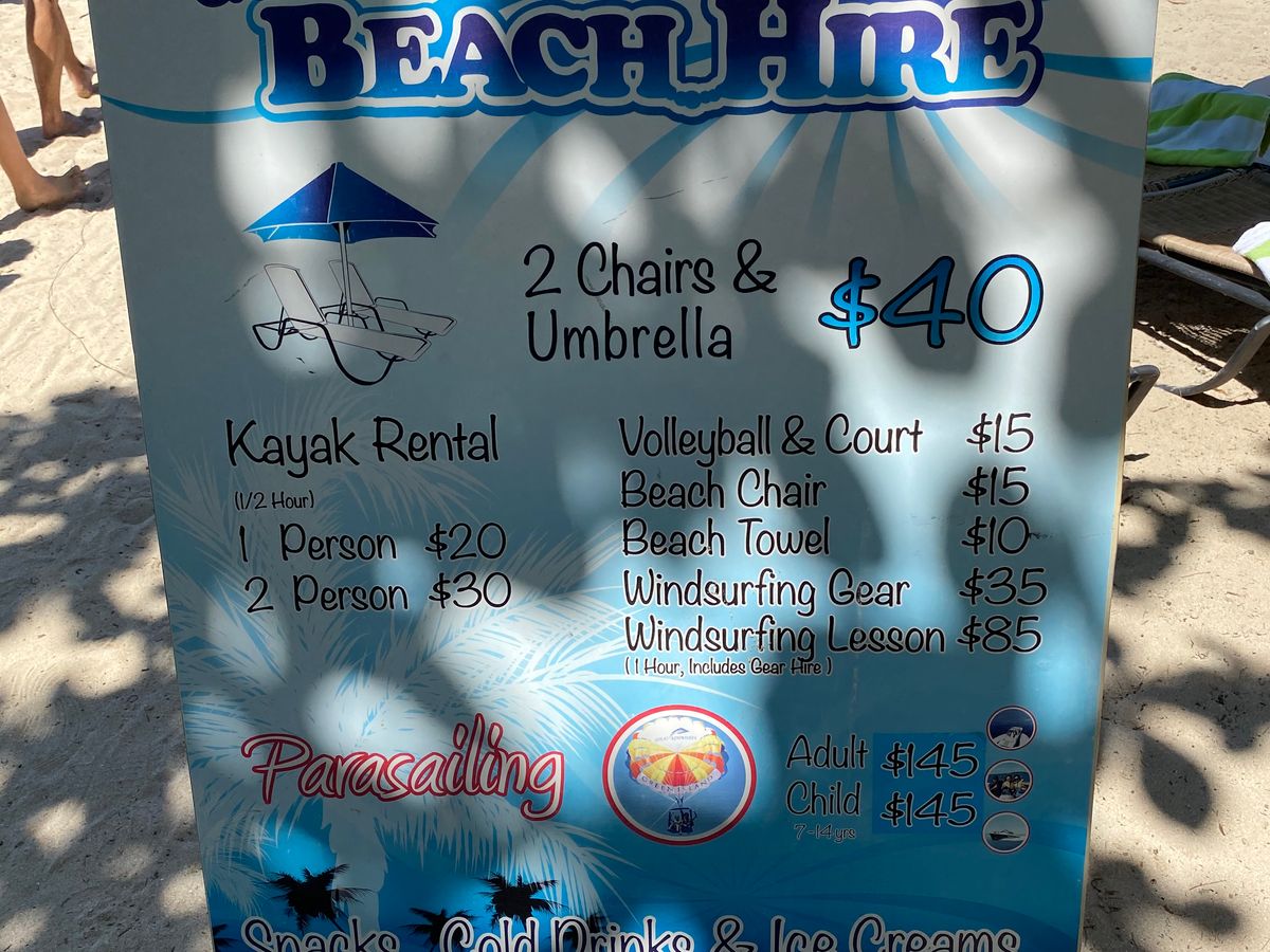 ・ビーチではチェアとパラソルがセットで置いてあり$40で借りられました。荷物を置いて休める場所があると便利だったので借りて正解でした。