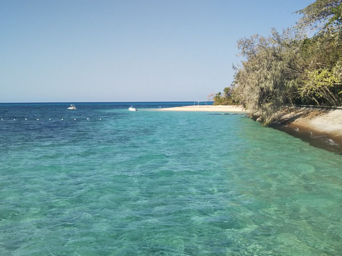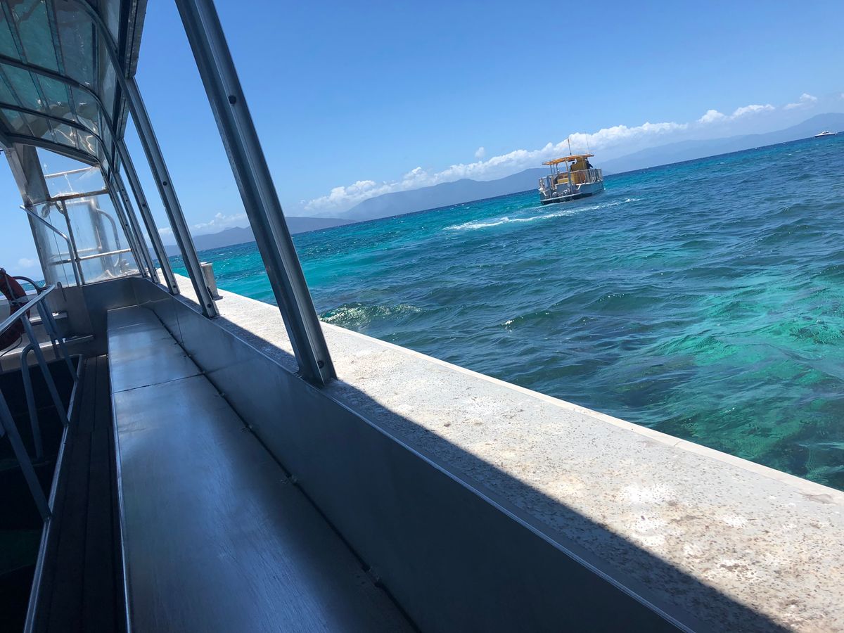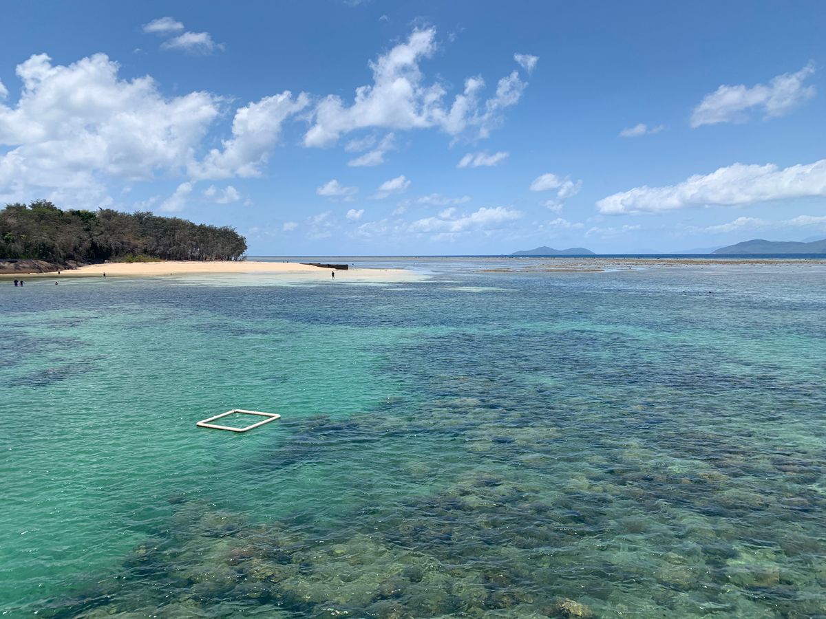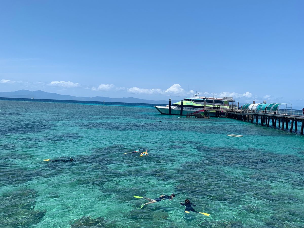 ケアンズに到着したその日に船で約45分のところにあるグレートバリアリーフ(グリーン島)に行きましたが、まさに青い宝石のようにキラキラと透き通る海が一面に広がっていました。船には日本語が話せるスタッフの方がいたのでグリーン島の乗り場確認やシュノーケル・グラスボトムボート選択が無事できました。私たちはグラスボトムボートに乗りましたが30分間乗っていて魚、カモメ、サンゴ礁、ニモ、カメを間近で見ることができ最高でした!お昼はエメラルドレストランで食べました。今回のツアーで唯一残念だったのがここ。お昼ご飯が正直おいしいのですが最高!とまでは言えませんでした。島は周るのに歩いて30分も無くて全体的に見て周れました。どこの浜辺も浅瀬の透き通る海ばかりで写真をバシャバシャ撮ってました。海に入らなかった私達が持っていて良かったのは帽子、日焼け止め、座るためのシート、タオルでした。日差しは暑いですが日陰だと割と過ごせるのでシートがあると綺麗な海を眺めながらのんびりできると思います!一番のおすすめスポットはグリーン島内に道があるのですがひたすら道に沿って行きお土産屋さんを右手に見えてもさらに進むと、あまり人のいない最強写真スポットがあります!!ぜひ探してみてください!