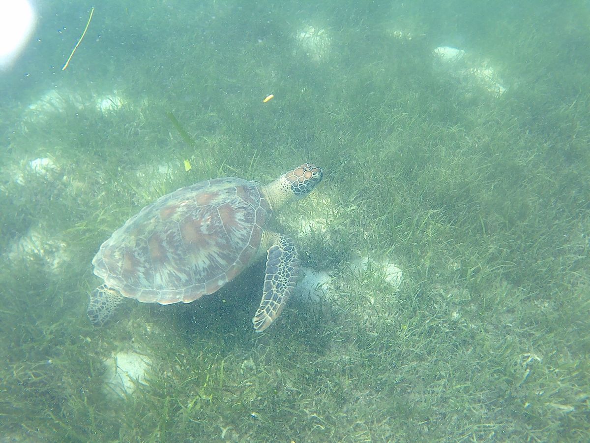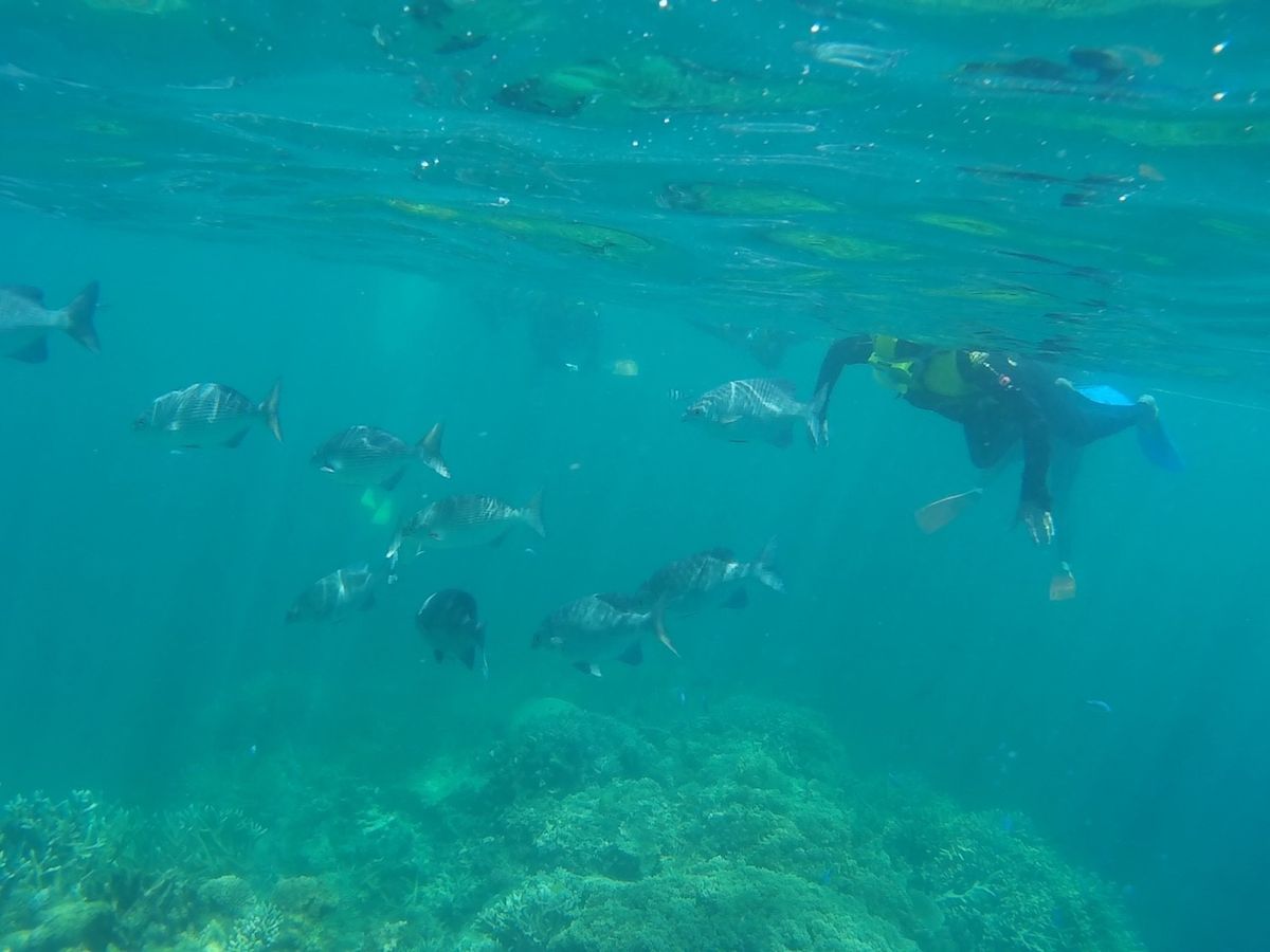 シュノーケリングでは浅瀬30メートルほどの区間のみ泳げます。それ以上奥に行くと急に深くなっていて危険だし、30メートルの浅瀬でも大小様々な魚やエイ・亀などが見られました。ただし珊瑚は見られません。